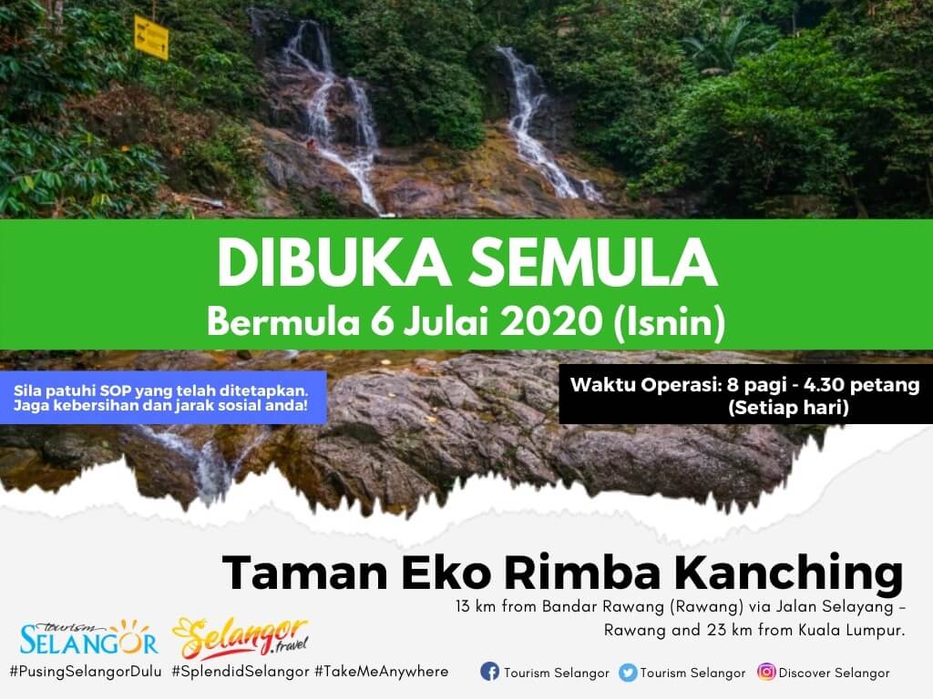 Sehubungan dengan itu, kawasan pelancongan seliaan Tourism Selangor, Taman Eko Rimba Kanching dan Chongkak Park & Resort turut kembali beroperasi dan dibuka semula kepada umum bermula 6 Julai 2020. Namun begitu, sebarang aktiviti perkhemahan adalah tidak dibenarkan, sehingga satu masa yang akan diberitahu kelak.