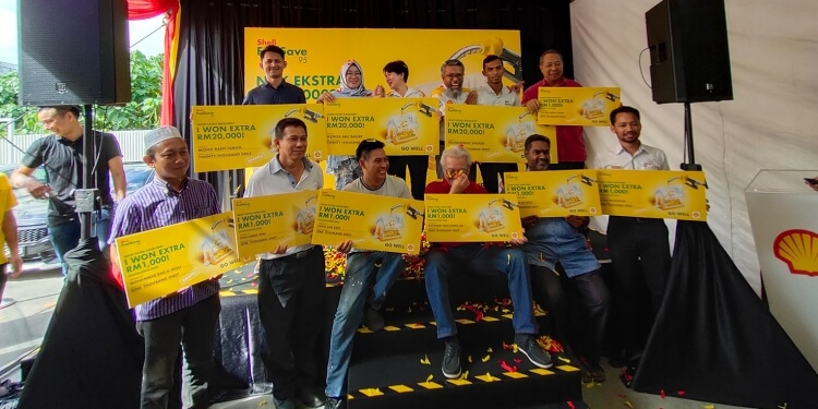EMPAT pengguna bertuah stesen minyak Shell diraikan oleh syarikat minyak antarabangsa itu pada majlis penyampaian cek berjumlah RM20,000 seorang dalam...