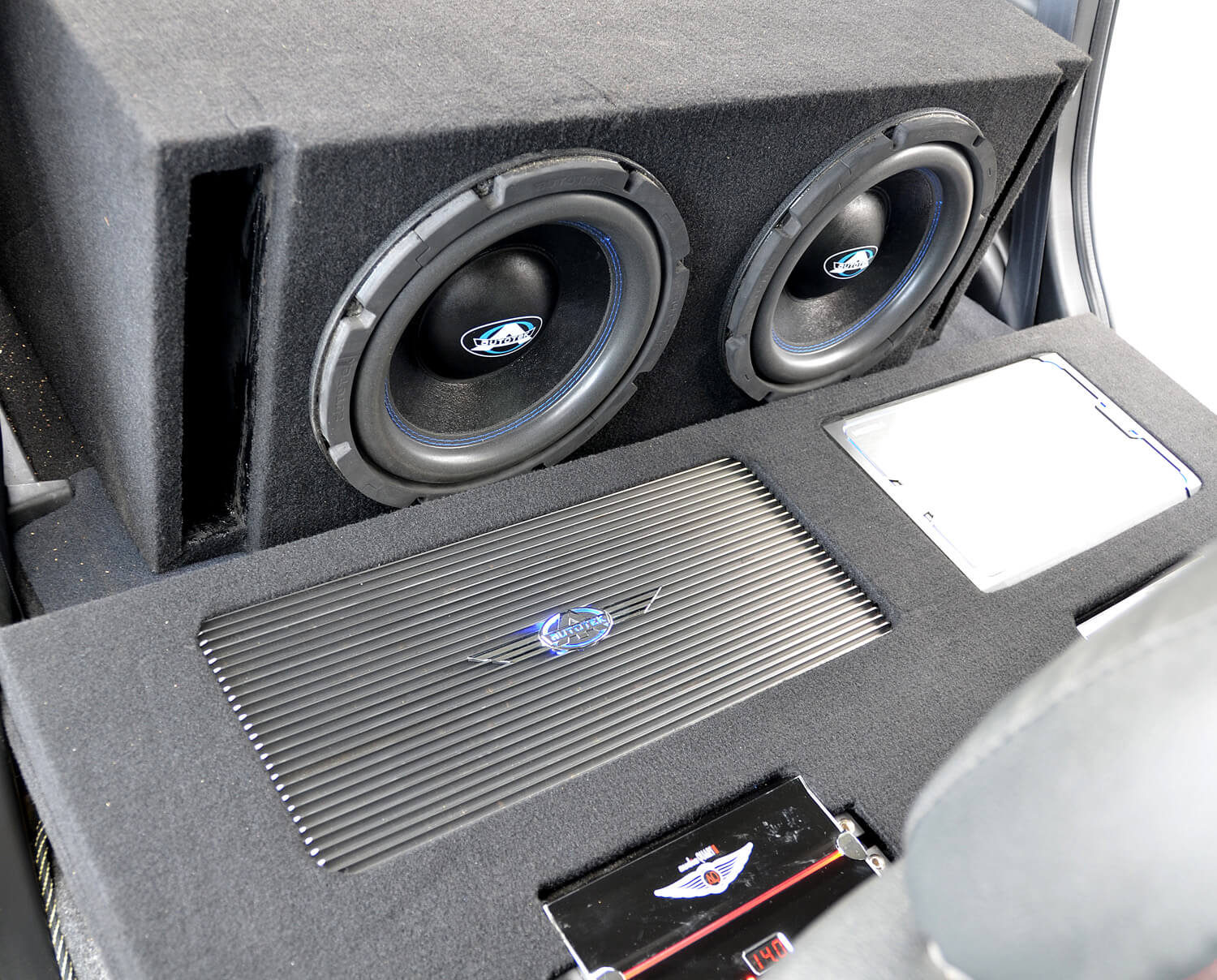 Kotak yang memenuhi kabin belakang kereta ini menempatkan 2 unit woofer 12” Autotek MM1204. Mungkin ramai yang tertanya-tanya kenapa perlu mengorbankan bahagian tempat duduk belakang hanya untuk sepasang woofer? Teorinya, penempatan begini menghasilkan bunyi yang padat sebagaimana sistem teater rumah. Masalah utama dengan pemasangan woofer jenis konvensional di dalam ruang bagasi membuatkan putaran bunyi terhad dan bahagian kedap dalam kereta menjadi halangan kepada keseluruhan dentuman tadi. Ia seperti anda menempatkan sub di bilik lain dalam sistem teater rumah.