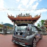 Bos menunggu di bawah pejabat dengan muka sinis. Ah tak apalah. Sepanjang perjalanan kami berbual panjang pasal majalah, kereta audio, kerja dan sampai di Pulau Pinang tepat jam 1 tengahari (ni kes berhenti minum dan makanlah). Sebaik sahaja sampai di depan premis kedai aksesori, saya dah nampak kelibat Myvi yang akan dirakamkan. Dengan langit yang mula menunjukkan tanda-tanda nak gelap, kami tidak membuang masa mencari tempat yang sesuai untuk sesi fotografi. Saya kira latarbelakang tokong ni menyelamatkan keadaan kereta yang tidak berwarna-warni ini.