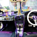 Seperti yang saya ceritakan di pembuka bicara tadi, bahagian dalaman kereta ini diubahsuai dengan tema VIP yang sangat ekstrem. Panel pintunya dibuat semula dengan bahagian gentian kaca dan semburan ungu mutiara, lelangit bumbung dibalut dengan fabrik Louis Vuitton, tempat duduk ‘bucket’ hadapan disalut dengan bahan berkilat yang saya sendiri tidak pasti ianya fabrik atau plastik.