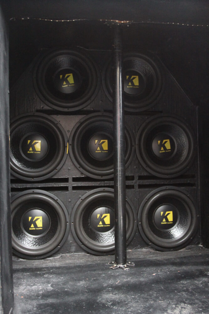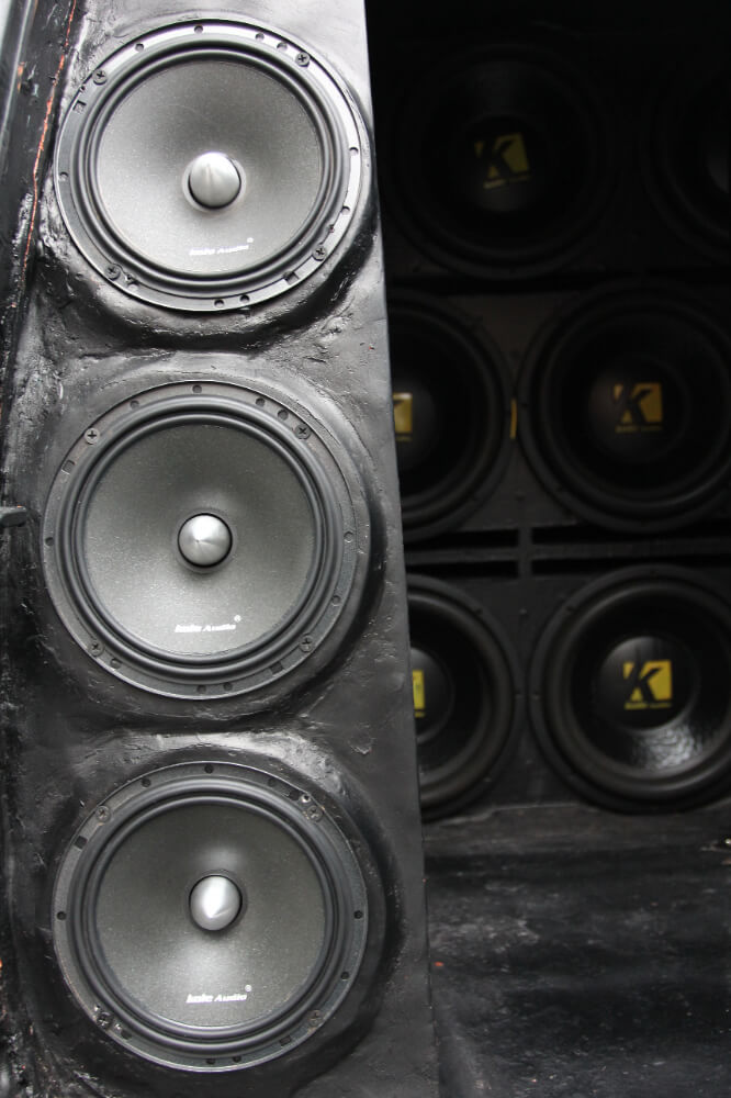 Scara relevannya, kapasiti yang dapat ditanggung sebuah Kenari adalah sangat terhad. Namun, Kenari yang berjaya mencipta sejarah ini memikul sejumlah 8 unit woofer 12”. Seunit woofer dianggarkan mencecah berat 10 kg. Kiralah sendiri berapa berat keseluruhan dipikul Kenari ini! Ditempatkan di perumah yang dibina khusus di bahagian belakang, barisan woofer ini dikuasakan 4 unit amplifier monoblock Kole Audio.