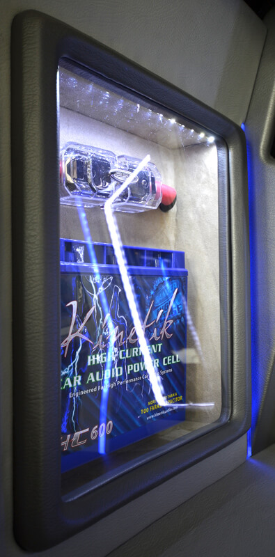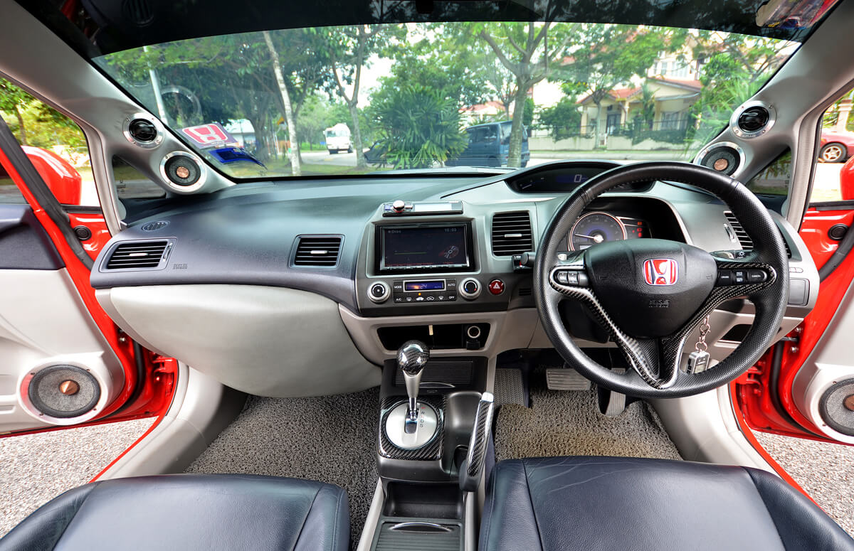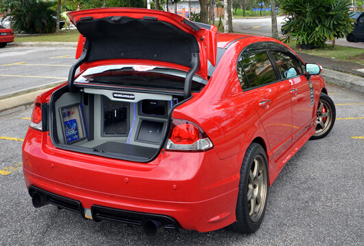 Kaedah pemasangan woofer di hadapan telah menjadi satu trend yang semakin popular hari ini. Ia bukanlah teknik yang baru tetapi rekaan kereta-kereta moden membolehkan ruang yang besar terhasil bilamana kotak glove ditanggalkan. Dalam kes Civic ini, setelah mengeluarkan laci tersebut, ia boleh menempatkan seunit woofer 10” dengan hanya sedikit modifikasi.