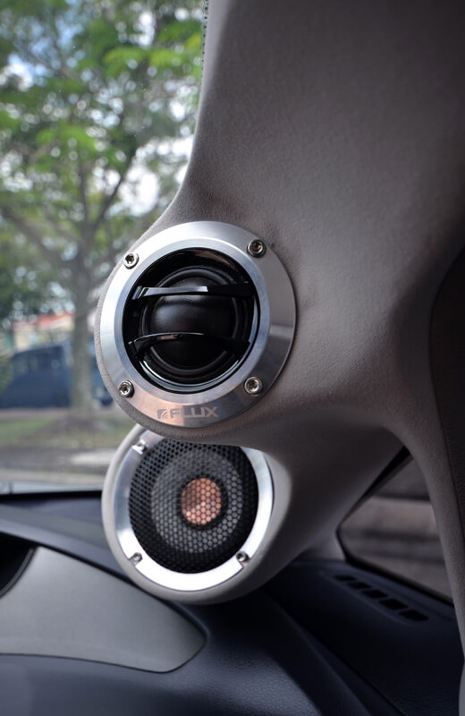 Kehadiran sistem bunyi 3 hala yang dibuat membabitkan pemasangan set mid range Flux M80R berukuran 3” yang berkongsi pillar dengan 2 unit tweeter Flux HT28R. Saya bersetuju untuk katakan, saiz pillar Civic memang banyak membantu kerana rekaan kereta ini memberi banyak ruang untuk peralatan aftermarket dipadankan. Membantu frekuensi sederhana dan tinggi ini ialah penapisan gelombang bunyi untuk mengasingkan frekuensi yang dibuat oleh crossover passive Flux XR361.