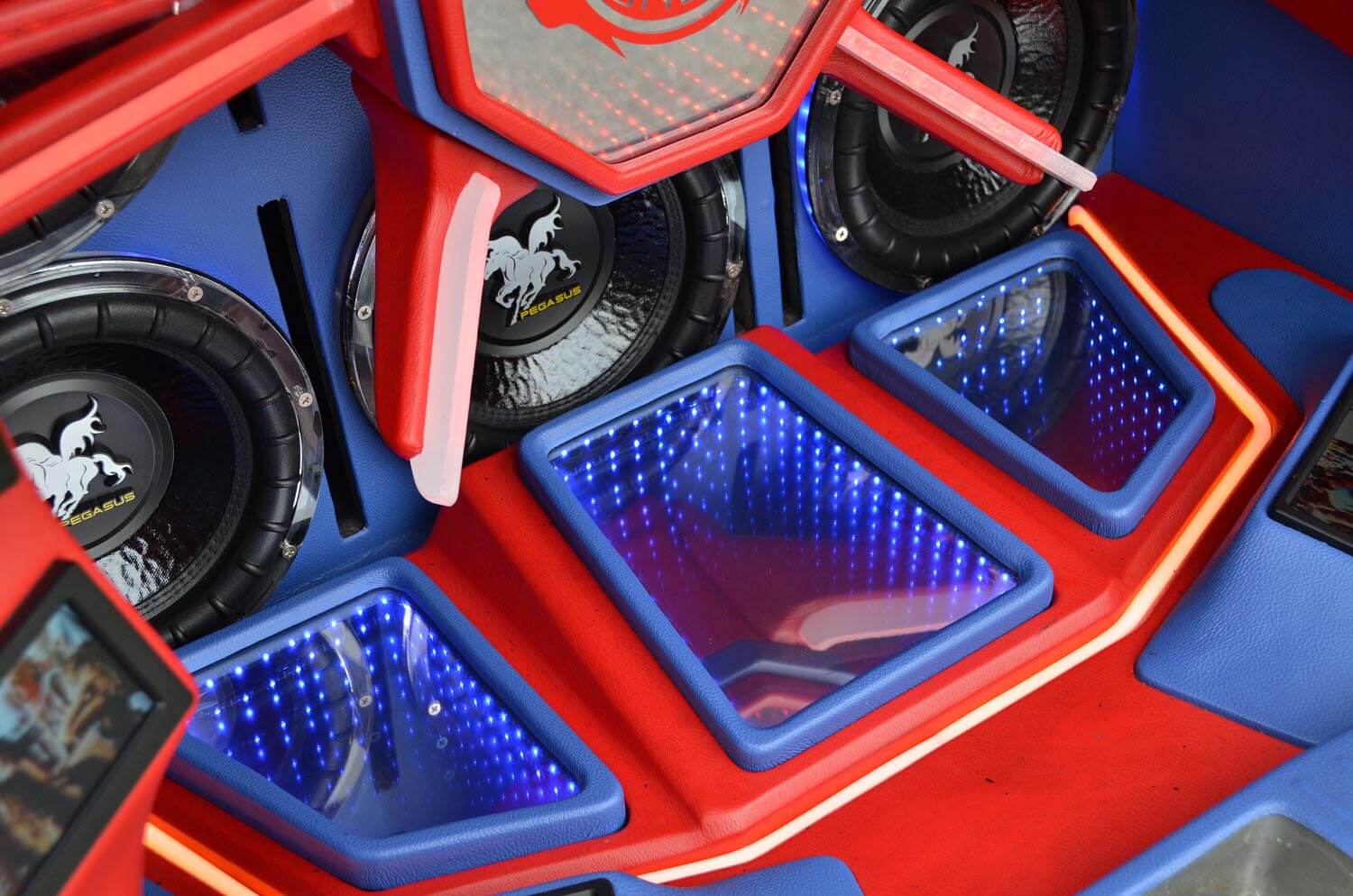 Jadi, installer membina dulu sebuah perumah custom yang sekali tengok, seakan-akan rupa “flux capacitor” mesin masa DeLorean dalam filem “Back to the Future”. Dengan jumlah woofer yang banyak, tempat duduk belakang terpaksa dibuang untuk menempatkan perumah custom tadi. Woofer yang digunakan ialah dari model Pegasus PG1850 yang masing-masing bersaiz 10”.