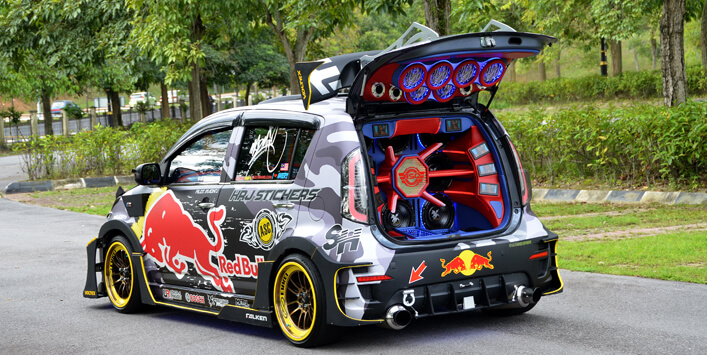 Perodua Myvi yang anda boleh lihat ini bagi saya tergolong dalam kategori yang terakhir tu. Installer yang membuat kerja ni sememangnya dah lakukan secara “all out” untuk menghasilkan bukan saja hasil bunyi yang menarik, tapi juga hasil seni kreatif yang hebat. Memandangkan projek ini dibuat untuk tujuan demo dan pertandingan, jadi sistem bunyi yang dipilih ialah SPL atau sound pressure level. Seperti yang anda tahu, membina sistem SPL pada casis yang agak kecil macam Myvi sememangnya amat mencabar oleh kerana masalah kekangan ruang.