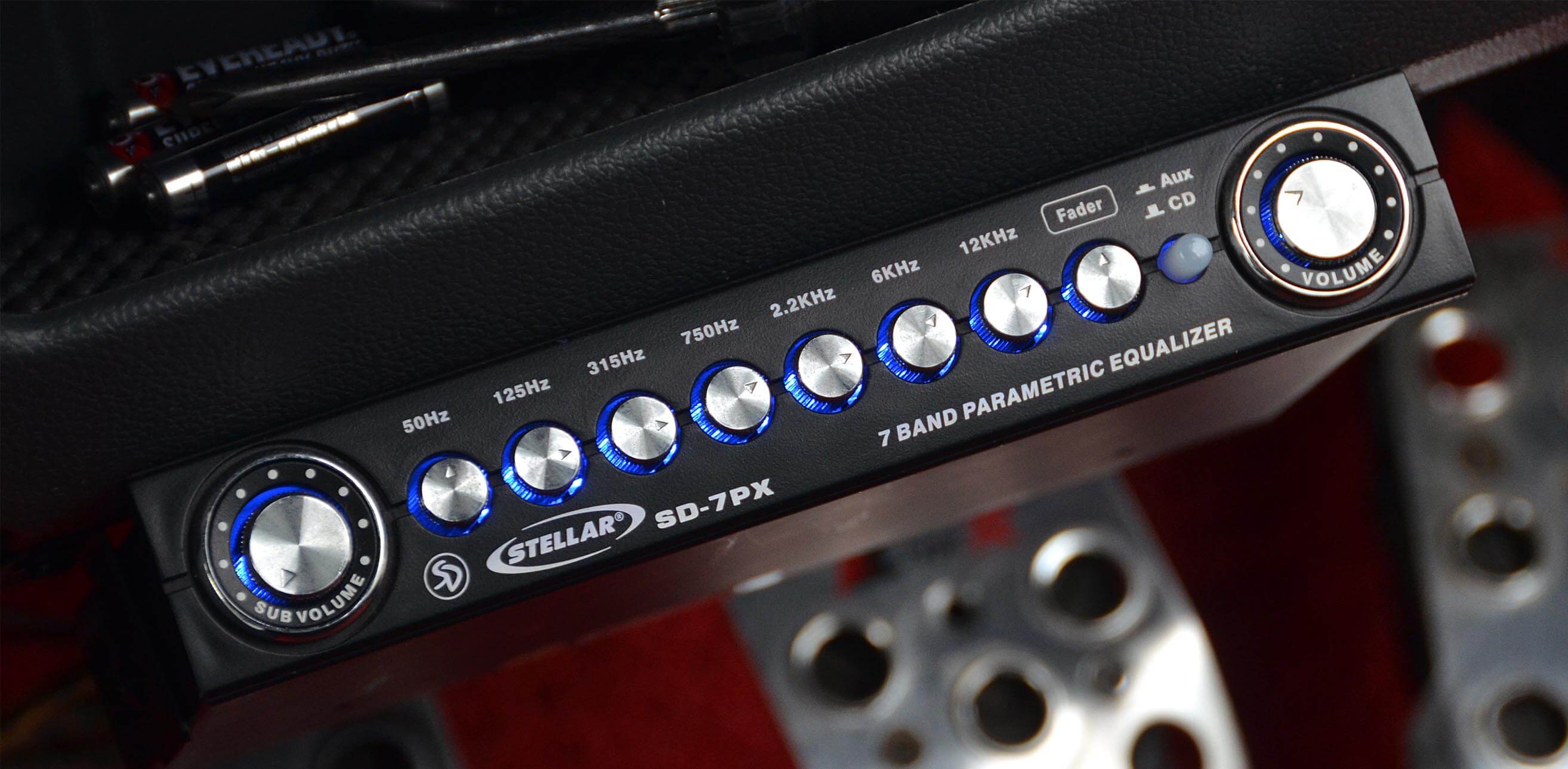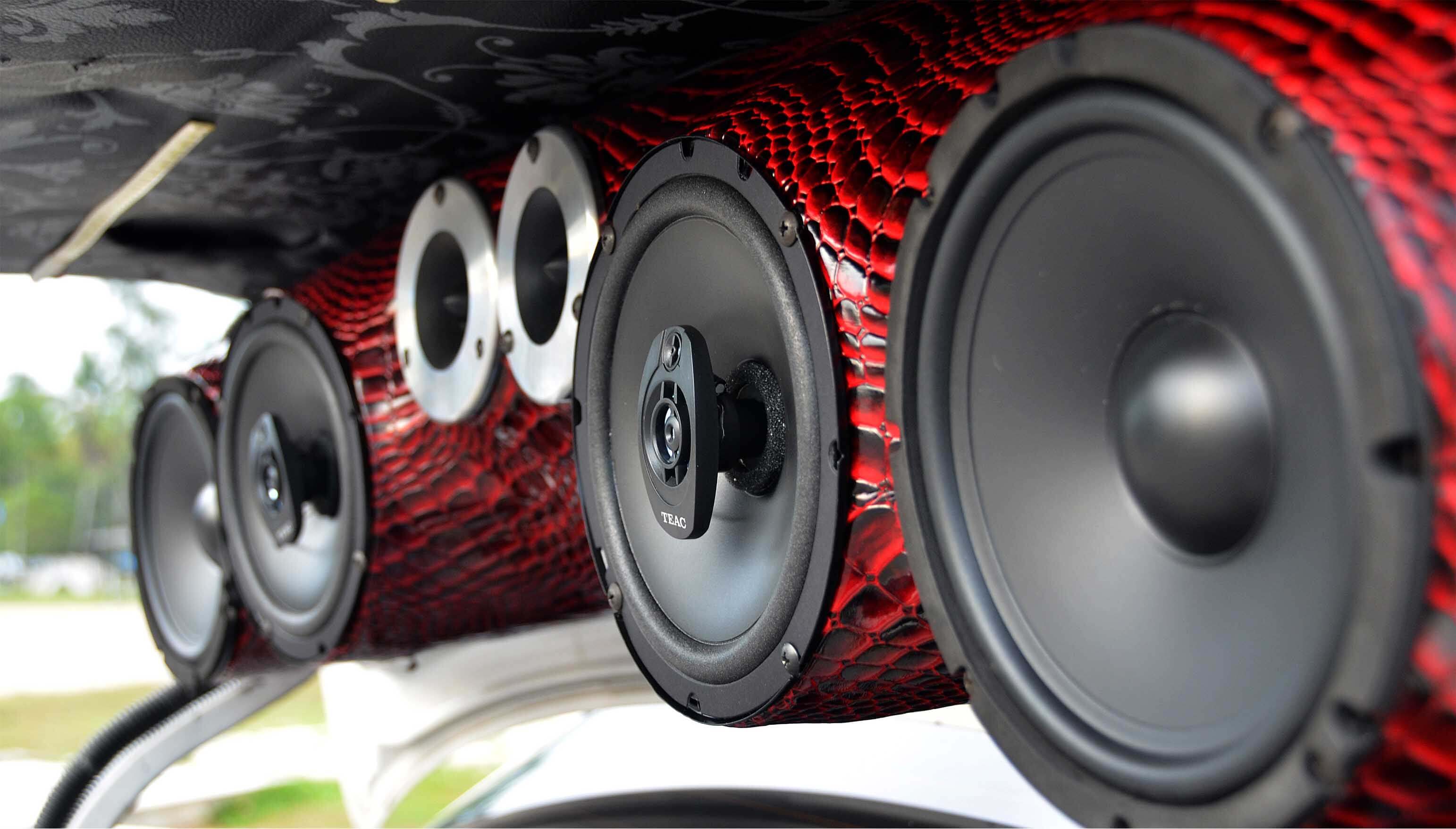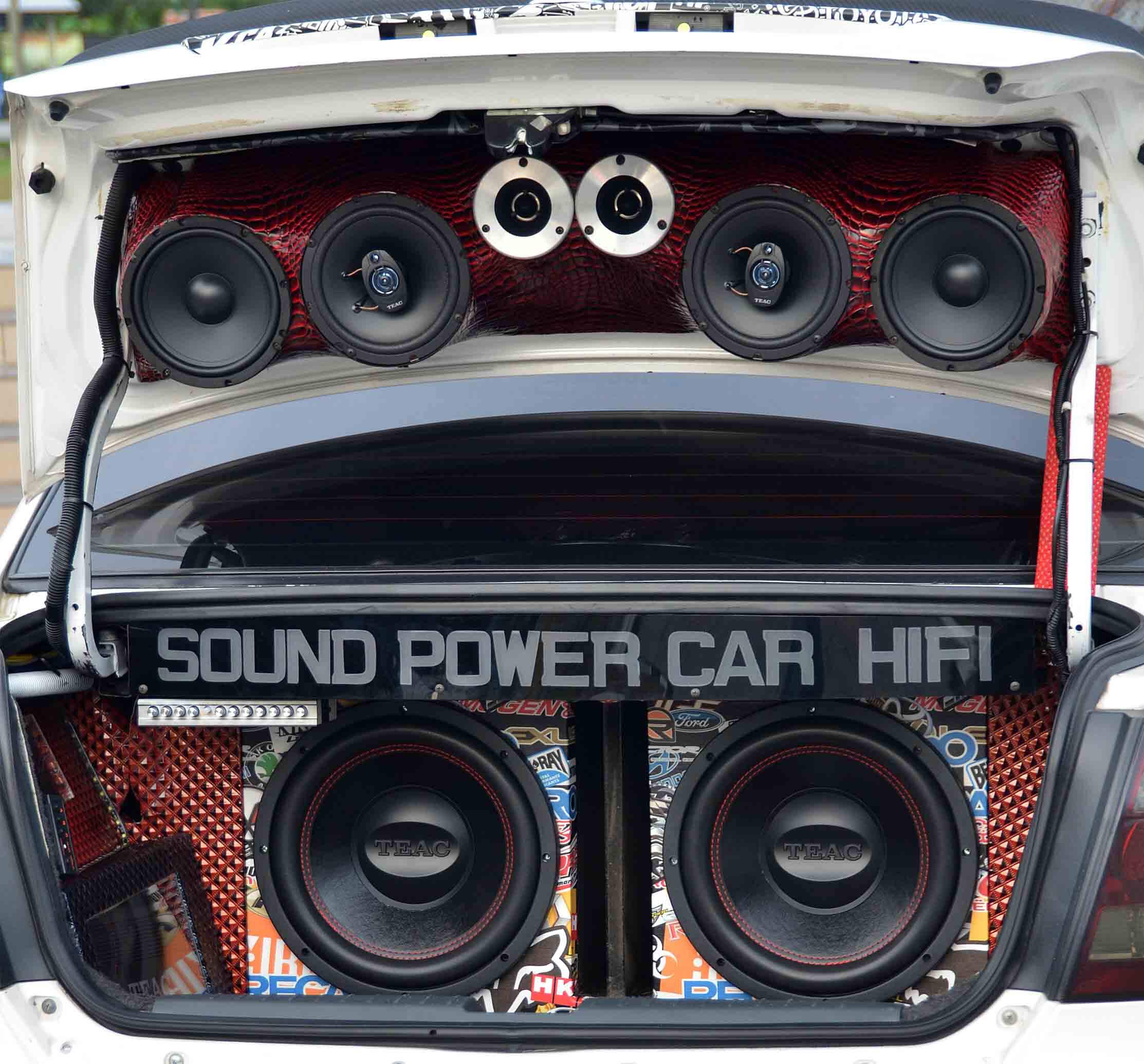 Dari unit Stellar SD-7PX ini pendawaian diteruskan ke dua unit amplifier 4 channel TEAC TE-A504 dan seunit amplifier monoblok Kicker. Amplifier 4 channel tadi kemudiannya menukar isyarat kuasa kepada bunyi yang dihasilkan oleh sistem yang tertumpu di bahagian belakang but. Ia terdiri daripada 2 unit mid TEAC TE-CS6, 2 unit speaker coaxial TEAC TE-S62 dan 2 unit horn tweeter TEAC. Perletakannya dibuat pada bahagian penutup but dengan perumah khas yang diperbuat daripada sekeping papan nipis yang dilekapkan di atas gubahan gentian kaca. Sebagai hiasan tambahan, unit perumah tersebut dikemaskan dengan pelekat vinyl merah bercorak garis hitam.