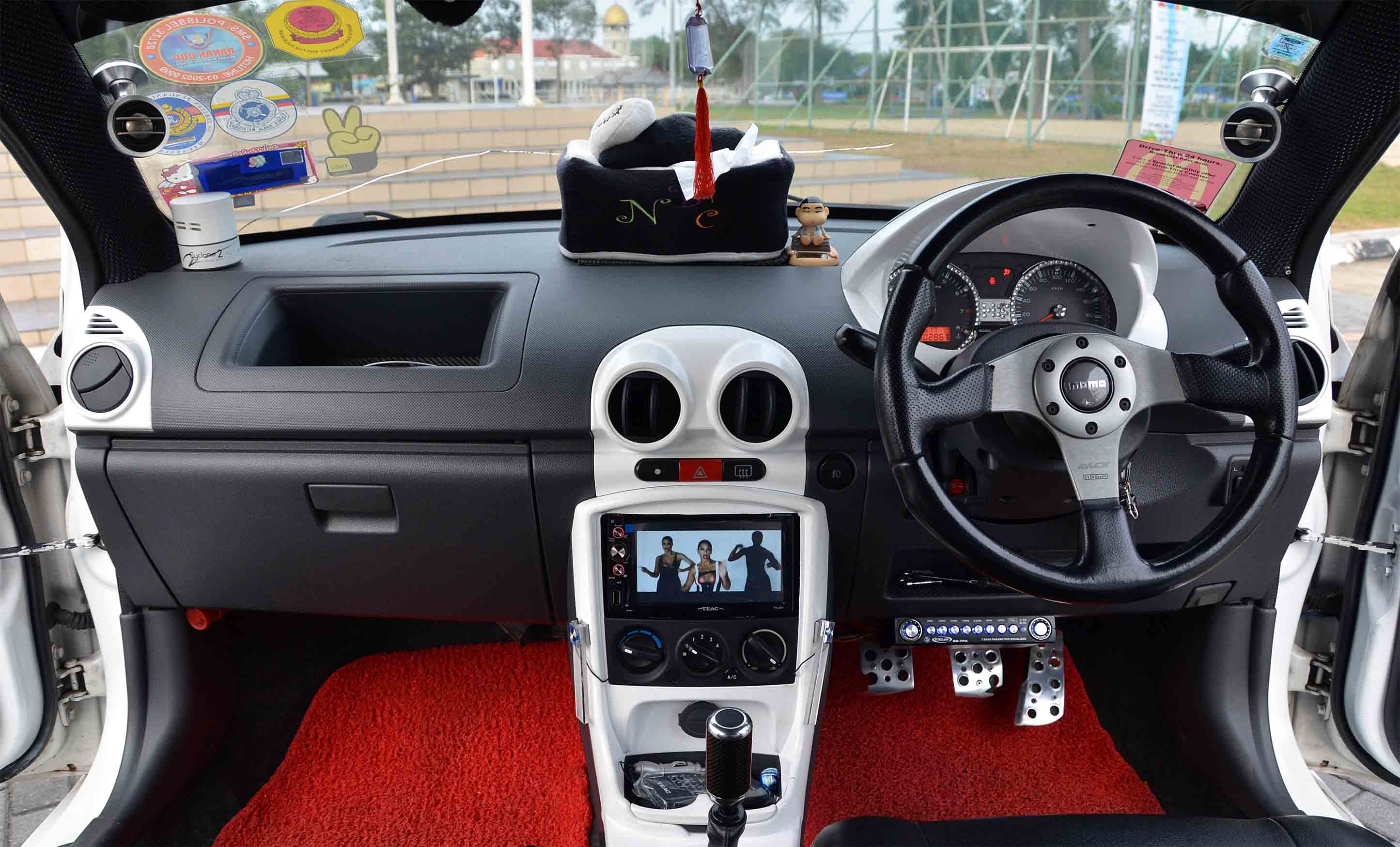 Seunit lagi amplifier monoblok dari iaitu Kicker KX1200.1 bertanggungjawab mengekstrak bunyi untuk 2 unit woofer TEAC TE-FW12 berdiameter 12” dan seperti yang biasanya dibuat pada 2 unit woofer di bahagian but, ia dipasangkan dalam kekotak custom. Bila ia sebuah kereta yang mahu dilihat cantik, istilah ‘make-up’ tadi diteruskan dengan trim pelekat Bomb dan tema 3D. Susunan amplifier dibuat rapi di kedua-dua sisi but yang menampikan hasil kerja sederhana tetapi memuaskan.