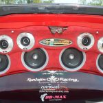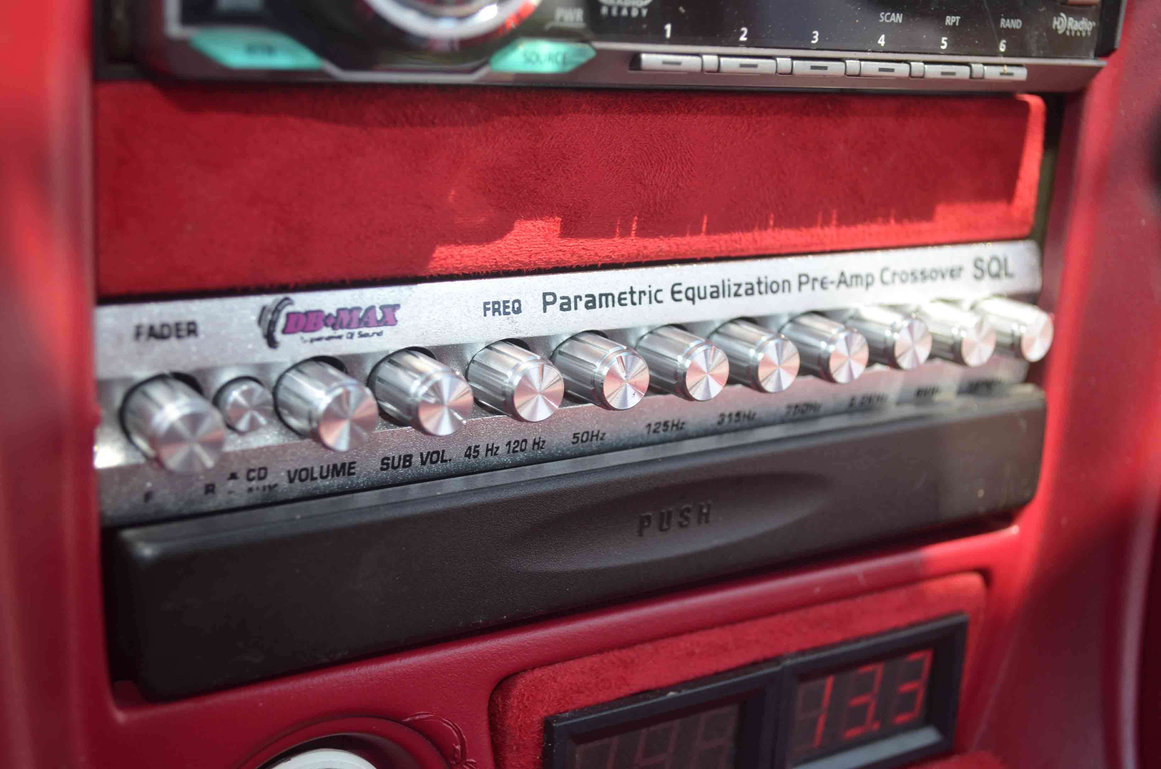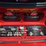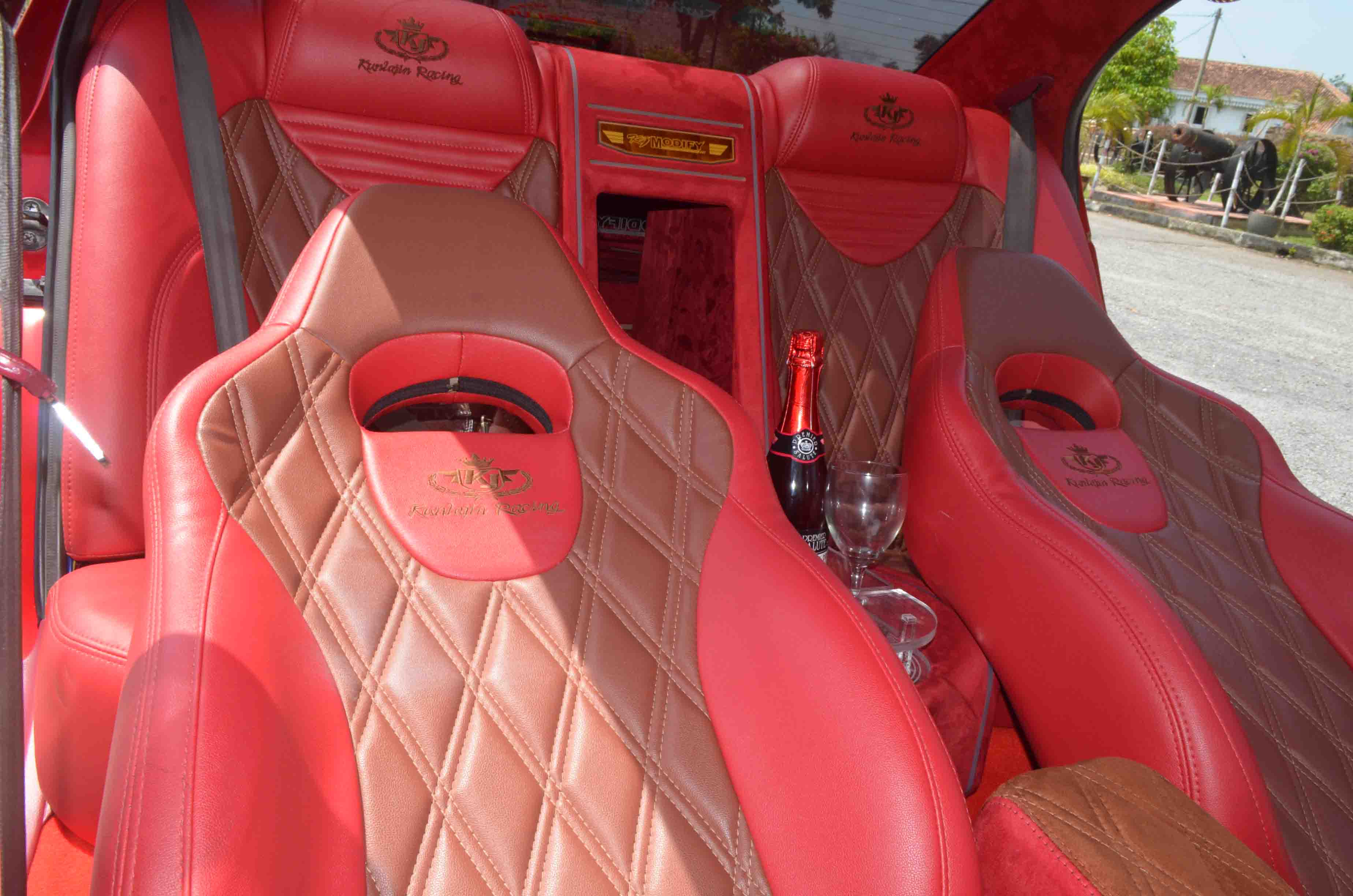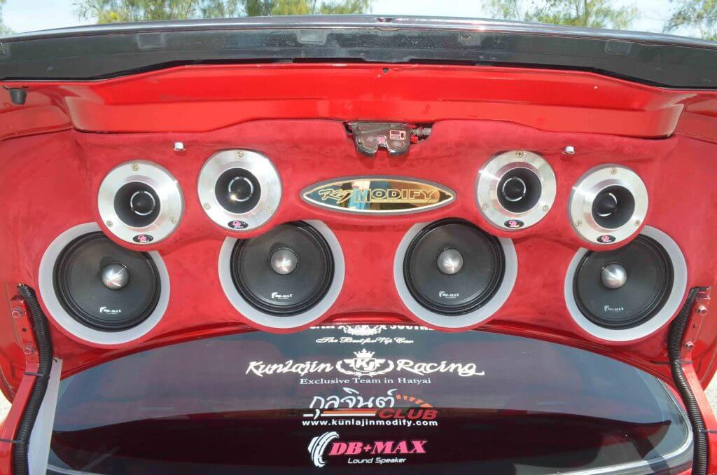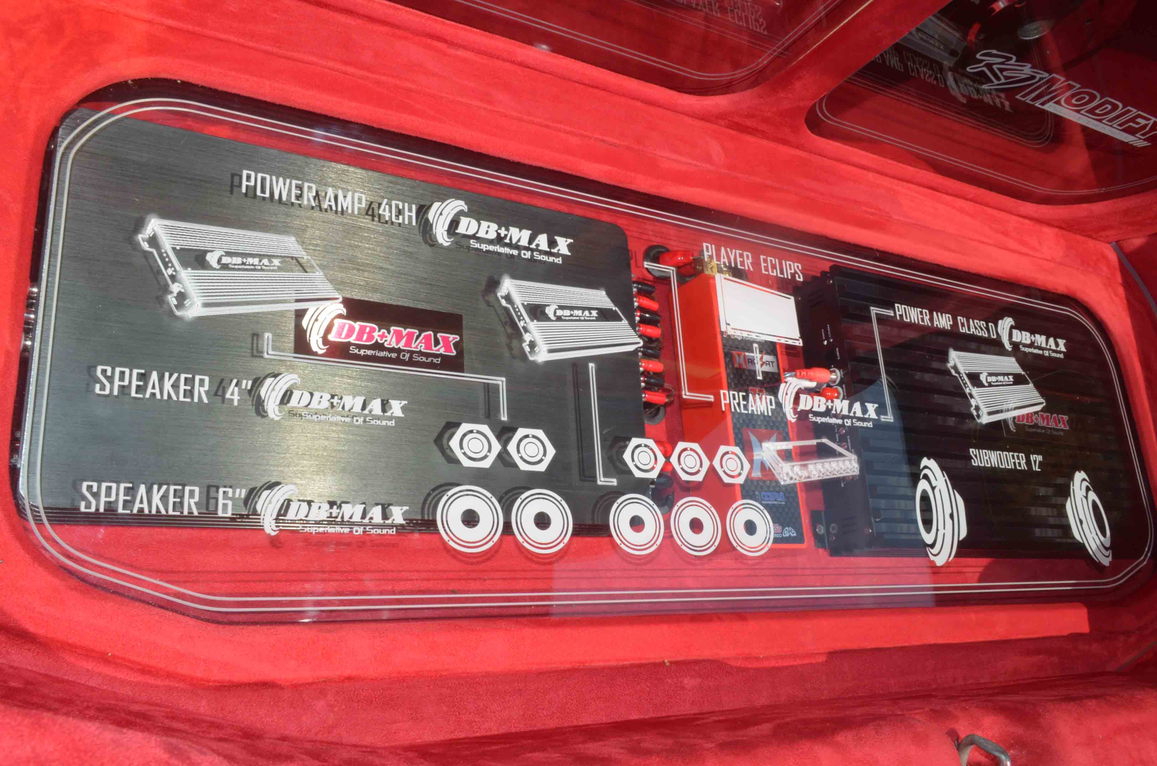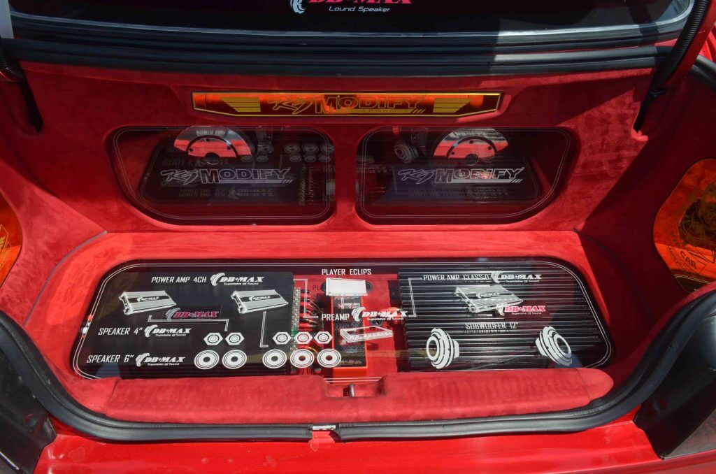 Menariknya tentang sistem audio di bahagian dalam, ia telah dibahagikan kepada dua. Bahagian satu, kabin dan bahagian kedua di tempat penumpang di belakang. Sebanyak 2 unit mid bass 6” DB+Max dan 2 unit tweeter DB+Max ditanamkan pada kedua-dua panel pintu di bahagian kabin. Manakala seunit unit bass 6” DB+Max dan seunit tweeter DB+Max dipasangkan di kedua-dua panel pintu di tempat duduk penumpang di bahagian belakang. Kemasan interior hasil kerja Kunlajin Racing berjaya menambahkan seri dengan pemasangan baldu gabungan rona perang dan merah.
