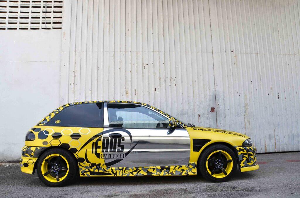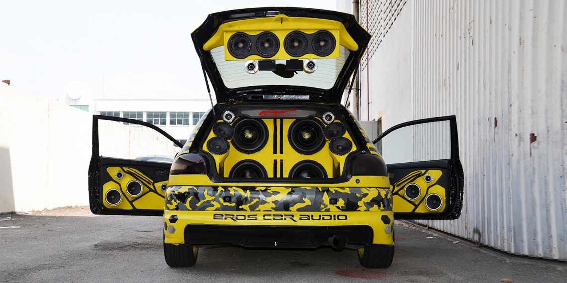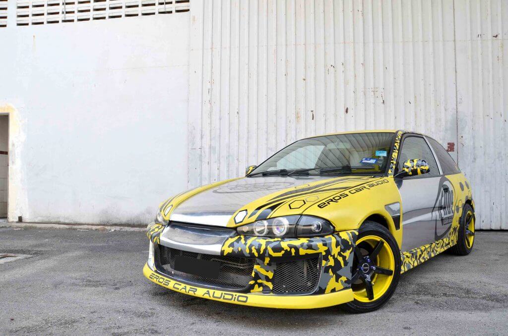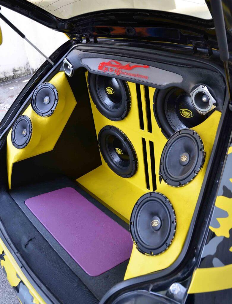 Oleh sebab itulah, installer akan melakukan kerja-kerja pemasangan segila yang mungkin bagi menarik perhatian orang ramai kepada kereta demo mereka. Proton Satria kuning ini ialah satu lagi kerja gila yang berjaya menarik perhatian kami. Dibina oleh K&H Car Accessories dengan menggunakan jenama audio Eros secara ekslusif, Satria ini berjaya menghasilkan bunyi yang cukup menggegarkan.