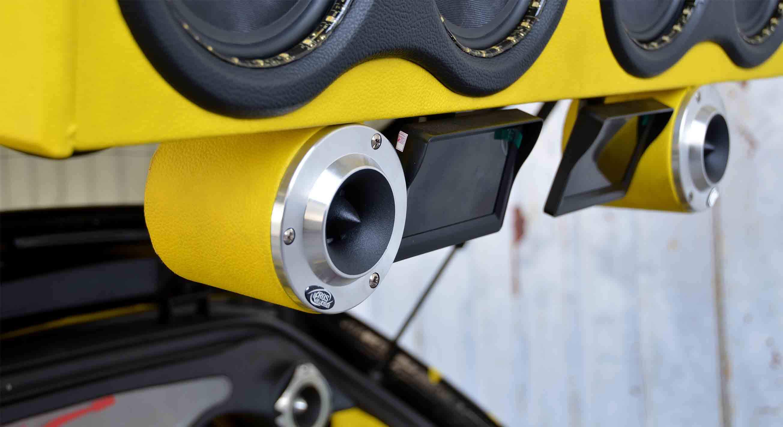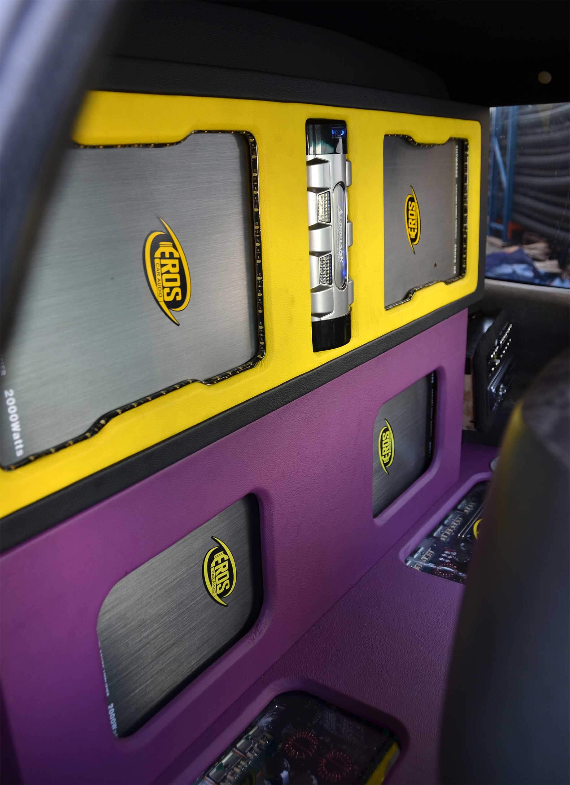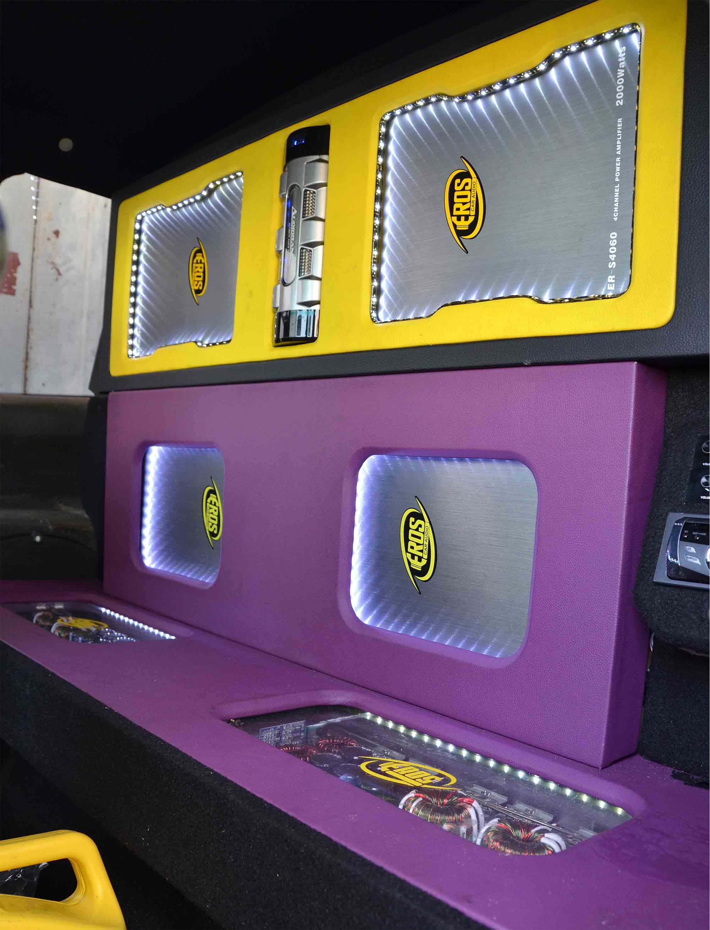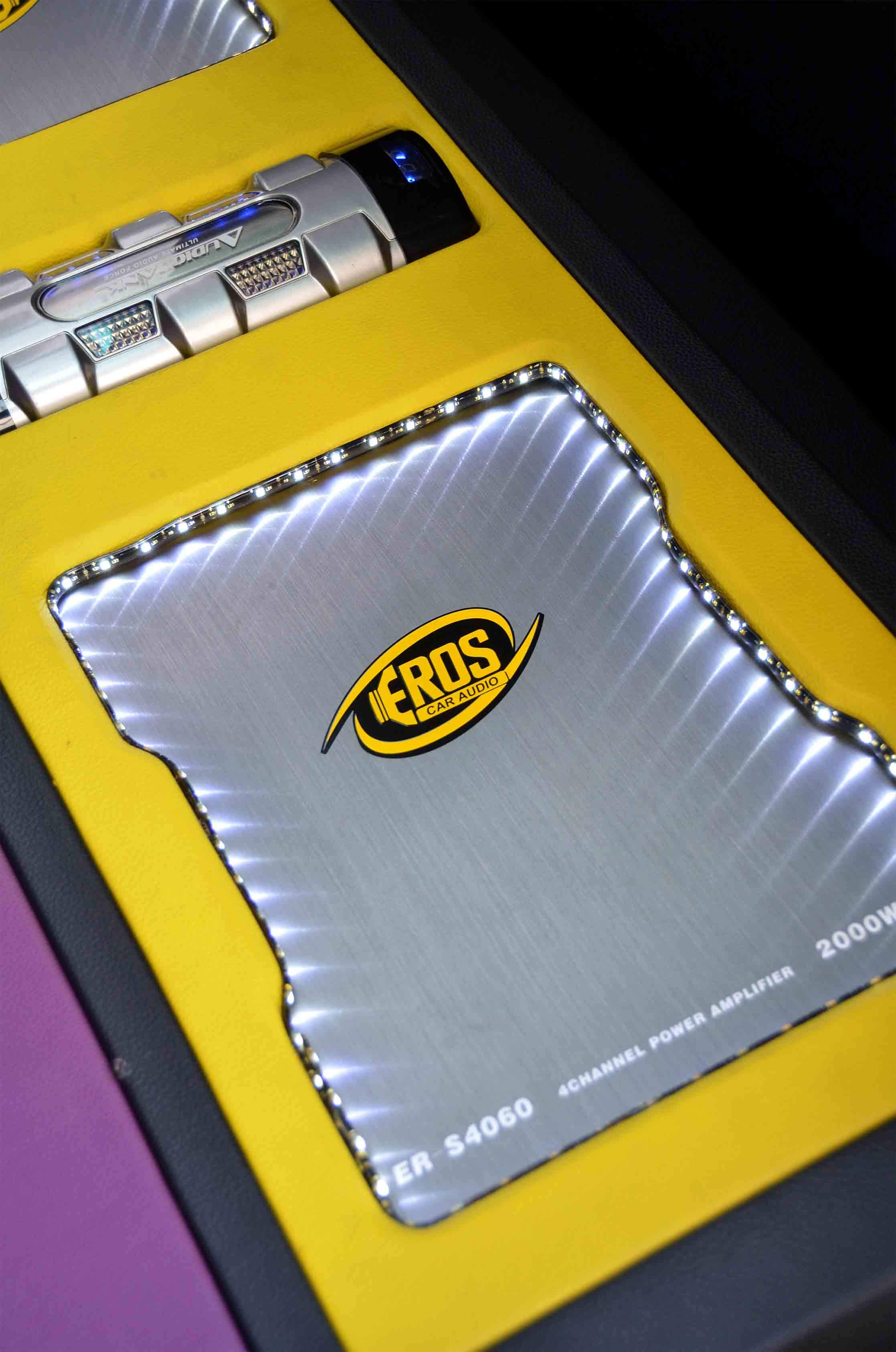Dari situ, isyarat bunyi dikuatkan oleh 2 unit amplifier 4 saluran Eros ER-S4060 yang bakal membekalkan kuasa kepada 8 unit speaker dan 4 horn tweeter! Installer memilih speaker Eros TR-S600 yang masing-masing bersaiz 6.5” dan horn tweeter Eros ER-HT2050 bagi menghasilkan bunyi muzik yang jelas dan nyata. Speaker dan tweeter berkenaan dipasang pada panel pintu depan di dalam perumah custom. Maknanya, 8 saluran dari gabungan amplifier-amplifier tadi telah dipecahkan bagi memacu kesemua speaker-speaker berkenaan.