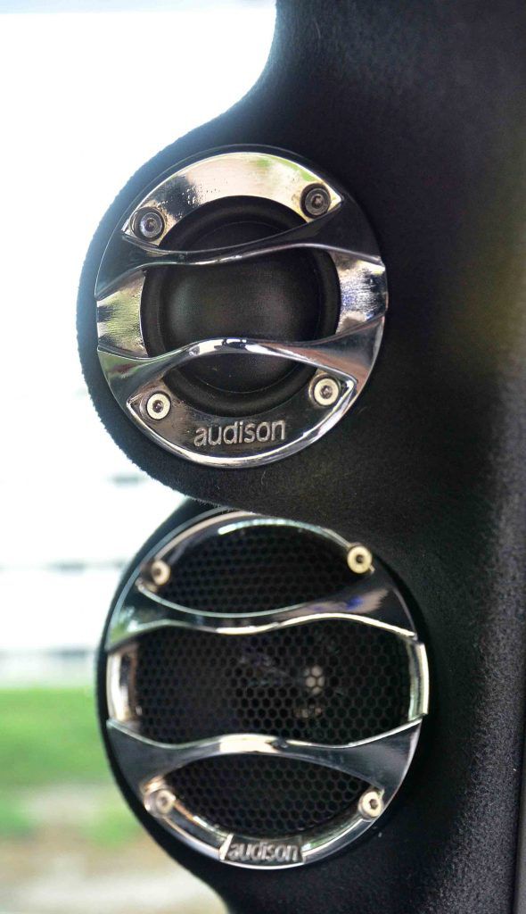 Speaker utama di bahagian pintu digantikan dengan speaker 6” Audison Sax. Set speaker ini bertanggungjawab memandu frekuensi penting di antara vokal dan juga melahirkan emosi muzik secara sekata. Ia dikuasakan oleh amplifier Due yang merupakan flagship Thesis bagi kategori 2 channel buatan Audison.