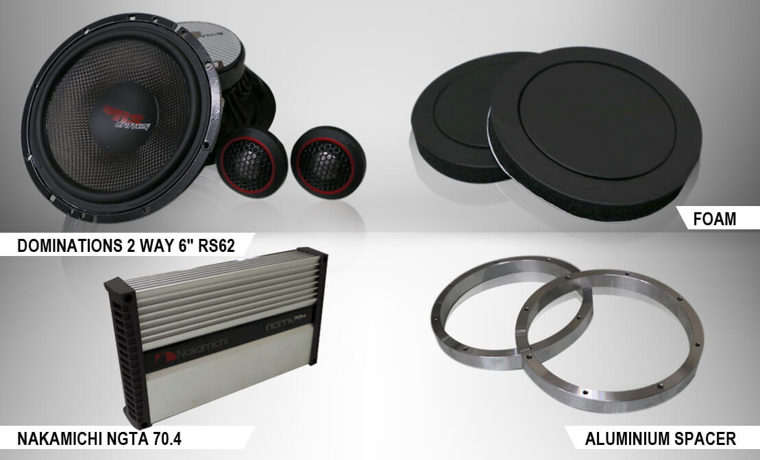 Seterusnya, bro Jack menambah set speaker Dominations 2 way 6″ RS62 bersama tweeter. Selain itu, Nick Cheong turut menggunakan aluminium spacer yang berfungsi membolehkan speaker dipasangkan dengan ukuran yang tepat tanpa perlu menebuk lubang. Betul-betul muat dan tak bergoyang. Diikuti dengan foam yang mempunyai fungsi sama. Kemudian, seunit amplifier 4 channel Nakamichi, NGTA 70.4 yang disepadankan oleh kabel RCA 2 meter dari Mohawk.