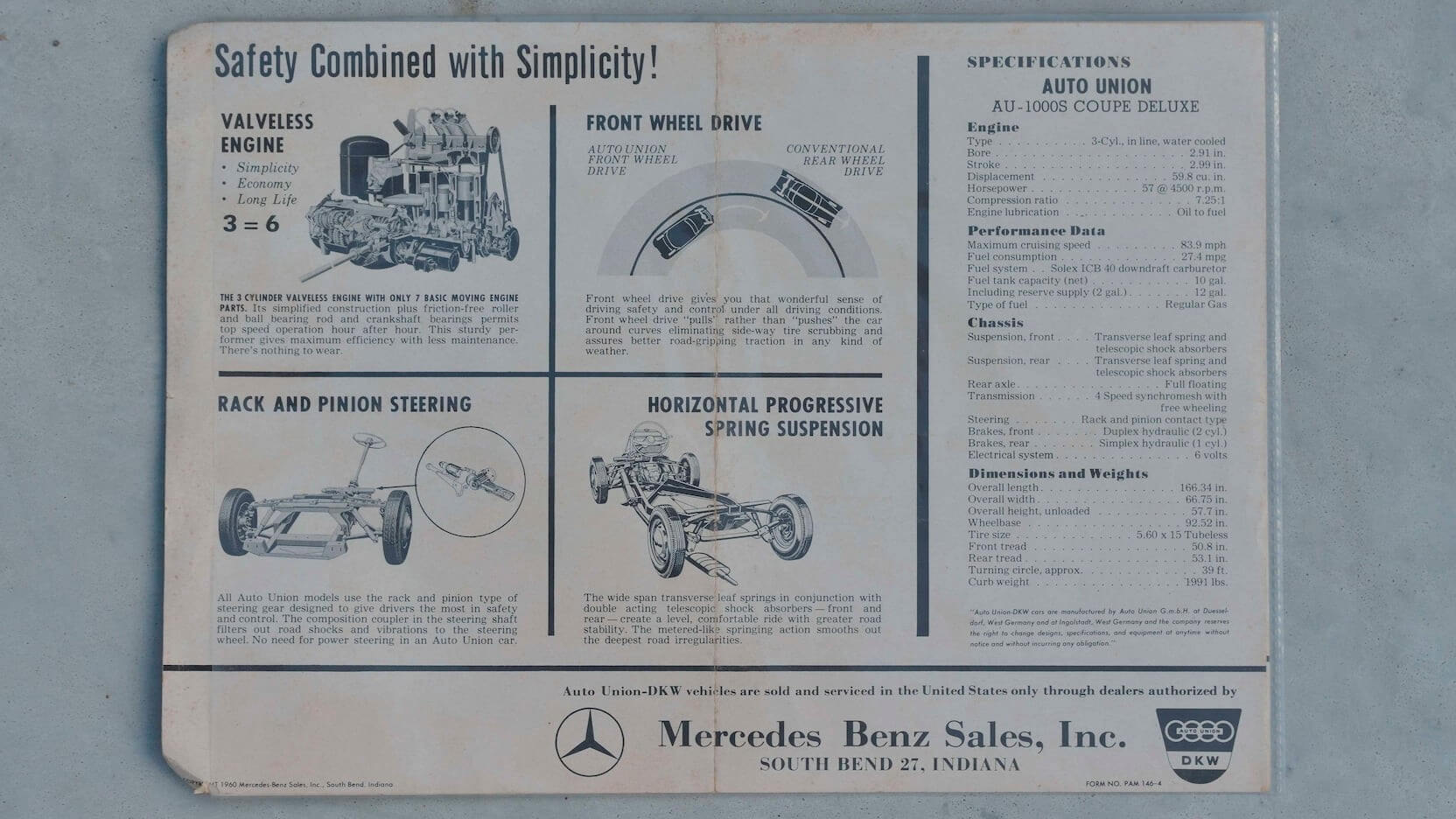 Berbeza dengan Audi yang kini sangat sinonim dengan ‘quattro all-wheel drive’ ia tidak ada pada kereta ini serta amat bertentangan kerana ia dipacu oleh sistem roda hadapan. Apa yang lebih menarik, Auto Union ini dikatakan sebagai kereta yang mengutamakan keselamatan. Mungkin kelihatan agak lucu tetapi ia menggunakan stereng keselamatan yang dilengkapkan bersama visor dengan bahan yang mampu menyerap hentakan.