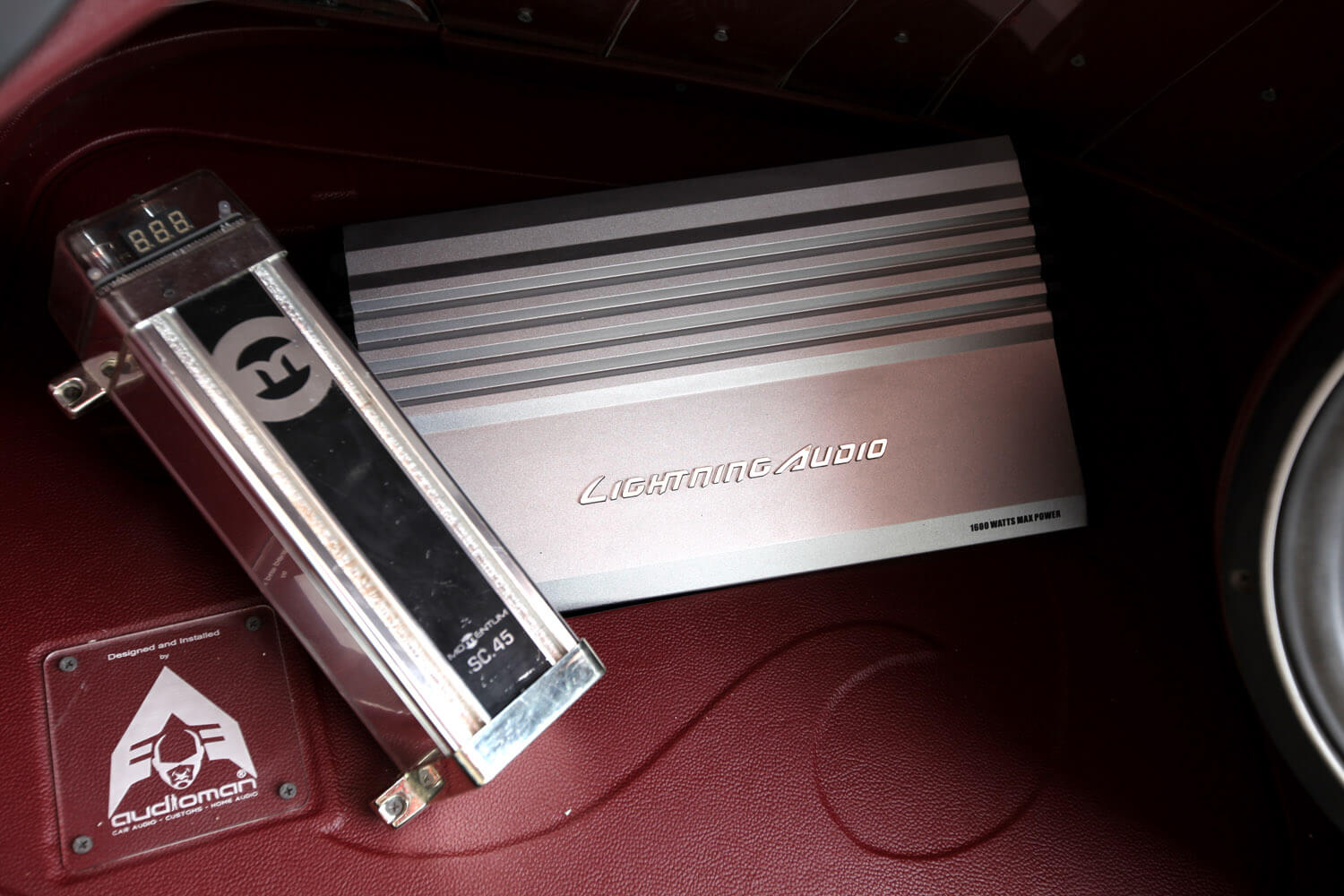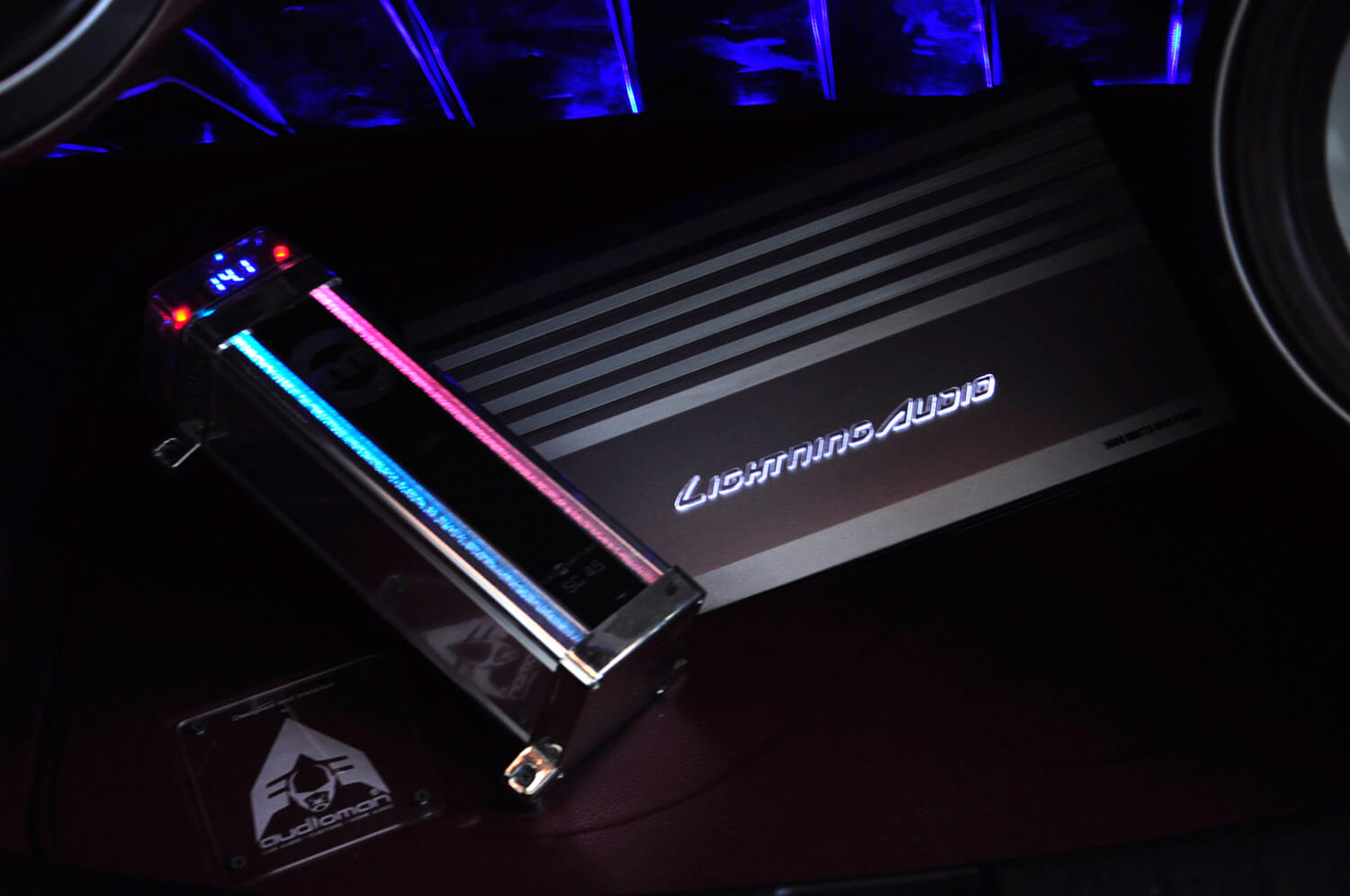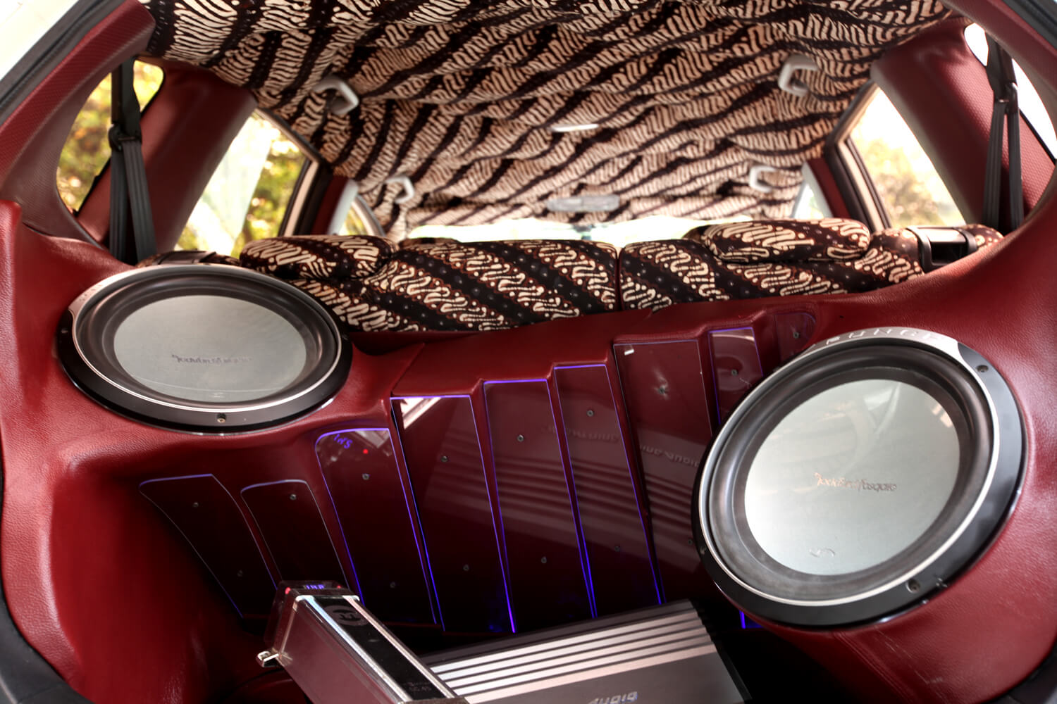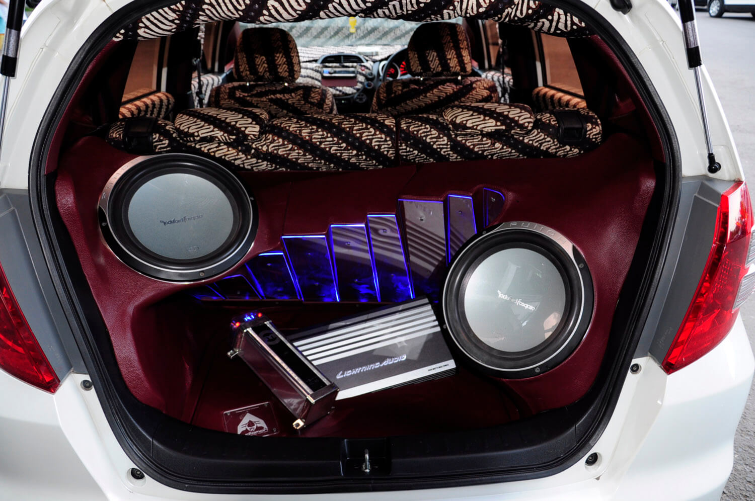 Di bahagian belakang, dilengkapi dengan 1 set speaker Pioneer dengan kosmetik bergaya bersama jajaran akrilik, memancarkan iluminasi dan menempatkan 2 unit subwoofer Rockford Fosgate berukuran 12 inci. Kedua-dua unit subwoofer ini sengaja tidak diletakkan sejajar dan dikuasakan monoblock Lightning Audio LA-4200. Hasilnya tidak mengecewakan dan seiring dengan cara ia ditampilkan. Sedap mata memandang, sejuk telinga mendengar…