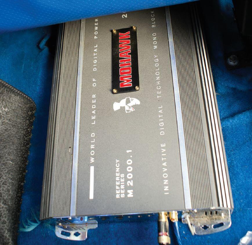 Amplifier 4 channel Mohawk MS-400.4 digunakan untuk memacu 4 biji mid bass 6” yang ditempatkan di bahagian belakang termasuklah 2 biji mid bass” di bahagian dalam kereta. Amplifier yang sama juga turut digunakan untuk memacu 2 biji tweeter. Fuh, cukupkah tenaga untuk memacu kesemua sekali tanpa menggunakan kapasitor atau bateri? Bagi memacu baki 4 biji woofer 12” Kicker Comp, Lan KJ menggunakan sebuah unit amplifier monoblock M-2000.1 dari jenama Mohawk.