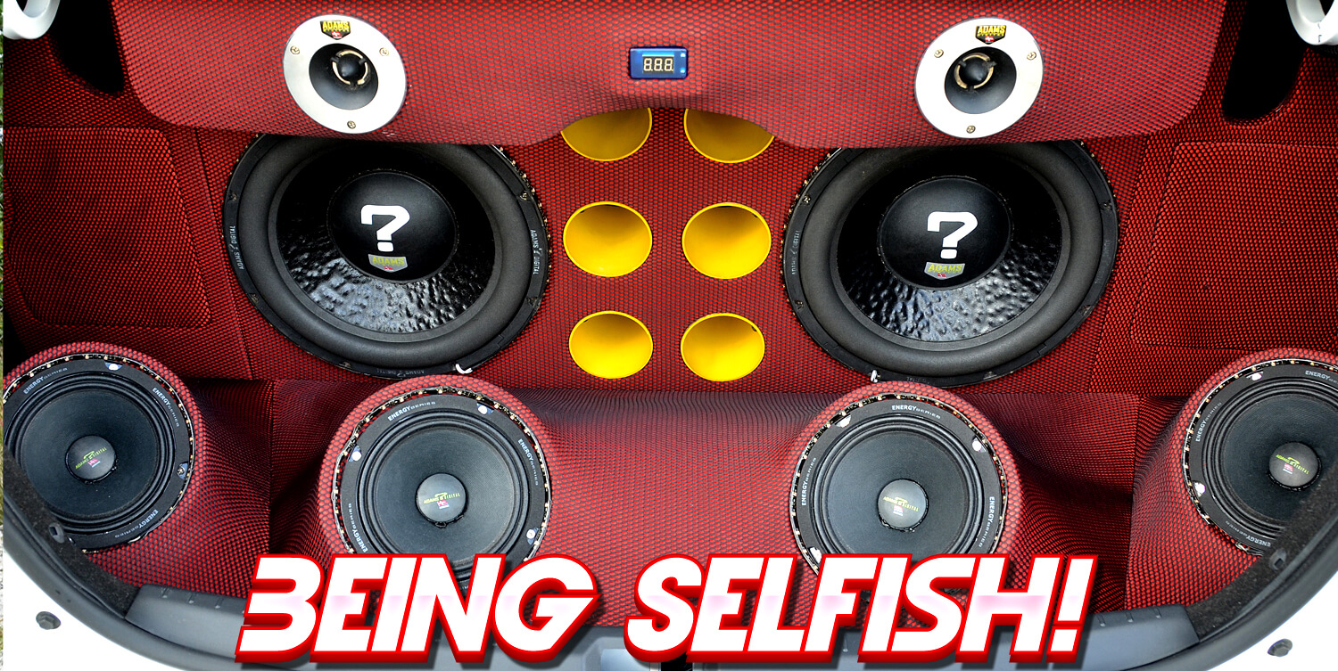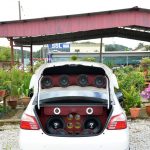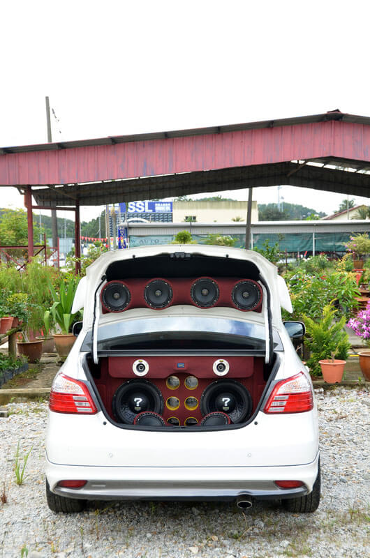 Dari luar, kereta ni mungkin kelihatan sangat biasa, tapi sebaik but belakang dibuka akan kelihatan susunan peralatan yang dibuat dengan cukup teliti, menandakan pemiliknya seorang yang serius. Kelihatan ialah 2 unit woofer 12” Adams Digital yang dilekapkan dalam kotak kayu buatan khas yang dibaluti fabrik merah hitam. Ia juga menempatkan selinder angin dan speaker.