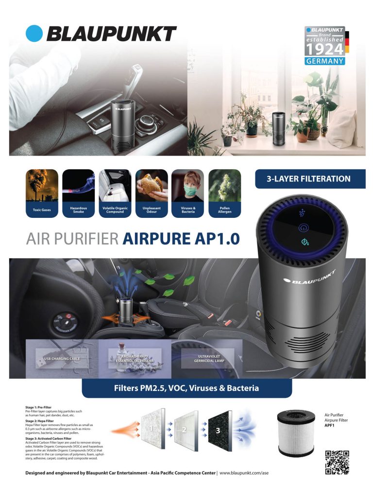 Tingkatkan tahap kebersihan udara dalam kereta dengan Blaupunkt Air Purifier AP 1.0 yang kini ada di pasaran. AP 1.0 mempunyai tiga tahap penapisan yang tinggi HEPA (PM2.5) hingga peredaran udara di dalam kereta anda bersih sehingga 99%. AP 1.0 akan segera menghilangkan bau asap rokok, debu, bakteria dan sebagainya dalam beberapa minit selepas diaktifkan. Terdapat juga lampu Germicidal Ultravioletyang menghapuskan dan menghalang pertumbuhan kuman dan bakteria bawaan udara dengan mengganggu DNA. Pemasangan yang sangat mudah, anda hanya perlu plug & play.