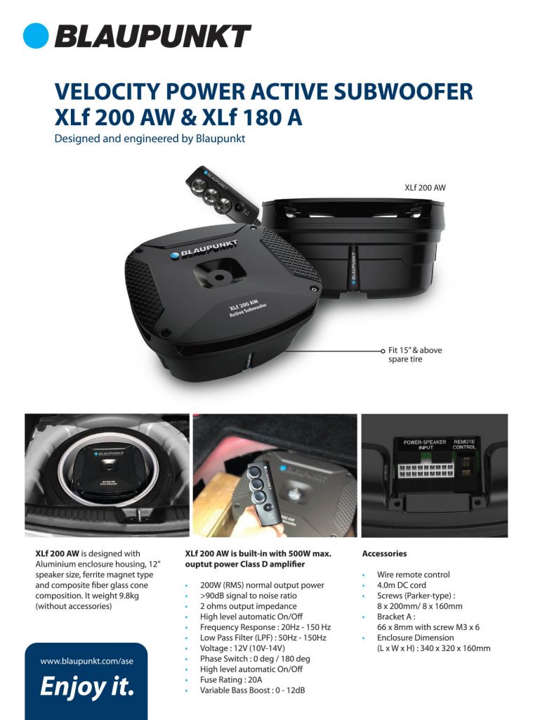 Bagi penggemar audio yang tidak mahu menggunakan banyak ruang untuk pemasangan sistem audio terutamanya yang melibatkan perumah woofer yang lazimnya dipasang dalam kotak bersaiz besar, Blaupunkt menawarkan pilihan yang terbaik untuk anda. Direka bersama perumah aluminium dengan woofer dan magnet ferrite. Didatangkan dalam dua pilihan saiz mengikut citarasa; subwoofer XLF 180 A (speaker 8”) boleh disimpan di bawah tempat duduk, manakala subwoofer XLF 200AW (subwoofer 12″) pula boleh dimuatkan di atas ruang tayar simpanan sekali gus menjimatkan ruang.
