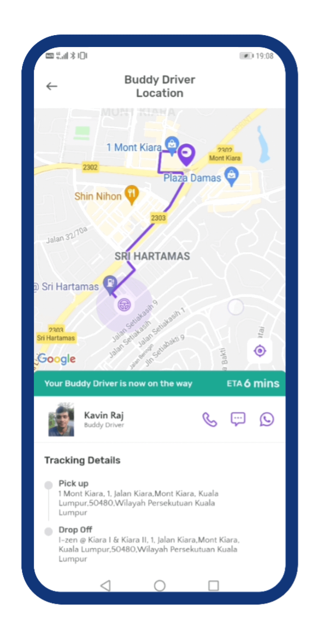 Mulakan persiapan anda sementara menunggu Buddy Driver, yang akan tiba di lokasi anda dalam tempoh 60 minit selepas pengesahan. Untuk keselamatan anda, pemandu anda akan menunjukkan ID Pintar Digital untuk pengesahan, dan anda boleh memulakan perjalanan!