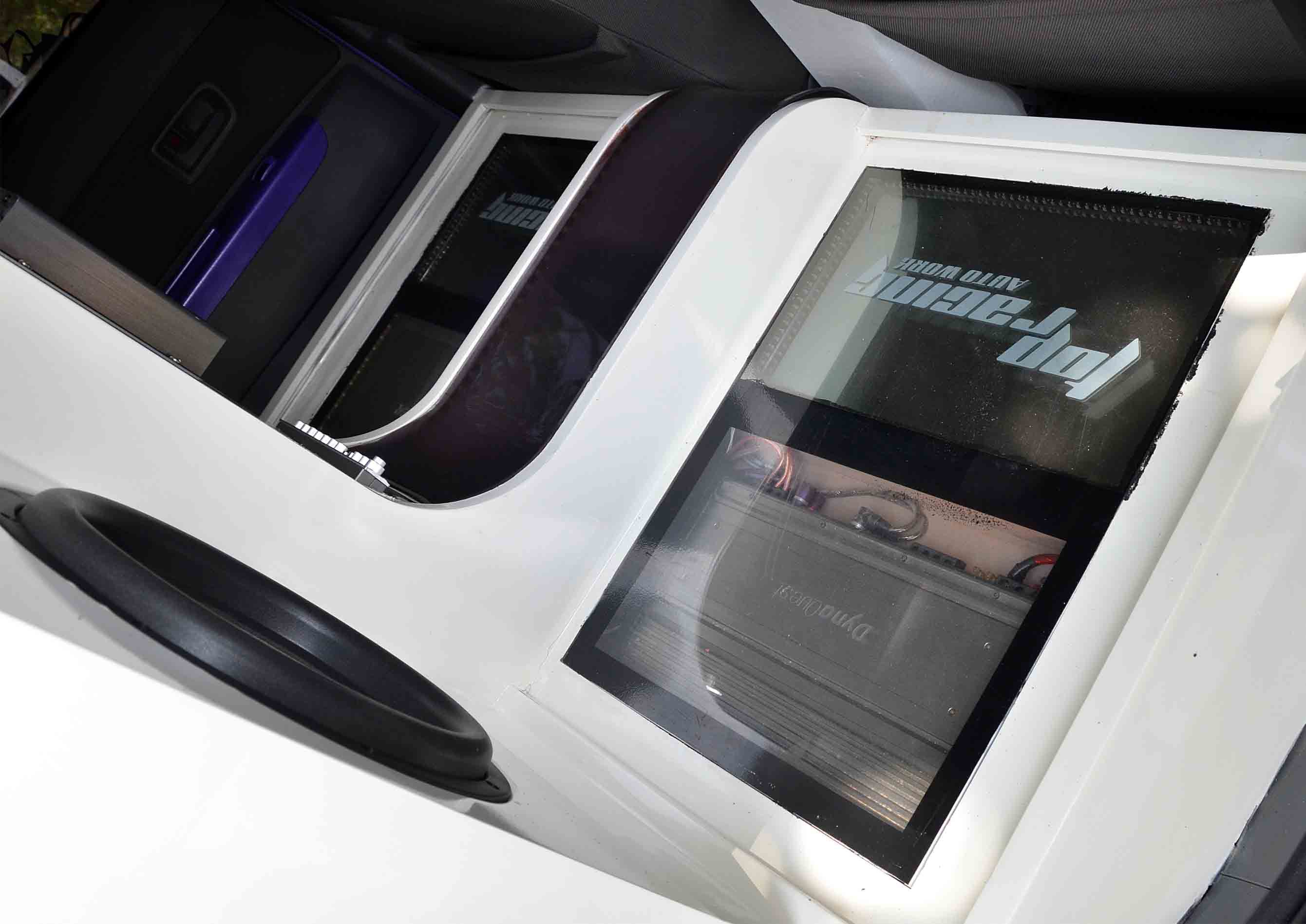 Di ruang bonet yang lazimnya diletak speaker dan woofer mempunyai kejutannya yang tersendiri di mana ruang ni dipenuhkan oleh sebuah TV LCD 42” yang jugak merupakan sebahagian aksesori yang diletakkan pada perumah custom yang diceritakan tadi. Dari segi bunyi, woofer yang diletak secara introvert bersama-sama kombinasi speaker 2 hala yang diletak di hadapan memberikan staging bunyi yang baik di mana posisi ini memungkinkan pemandu mampu mendengar bunyi dengan jelas.