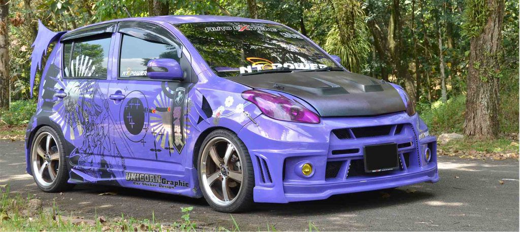 Memandangkan ianya sebuah kereta demo, tak lengkap kalau tidak dihias sepenuhnya dengan aksesori yang mampu menarik perhatian orang ramai ke arahnya. Myvi ni telah dipasang dengan bodykit dan pelekat rekaan custom bersama-sama rim aloi 17”. Warna asal pulak dah ditukar kepada warna ungu manakala ruang dalaman kereta dibalut sepenuhnya dengan bahan PVC berwarna putih.