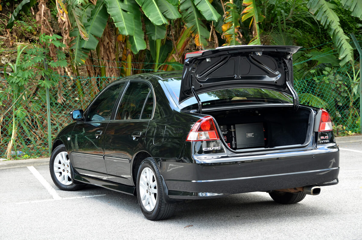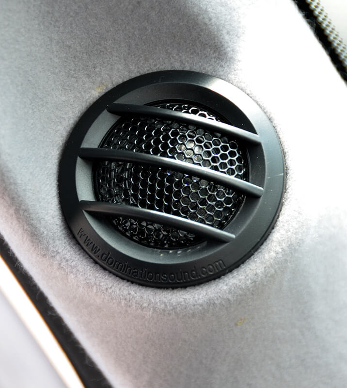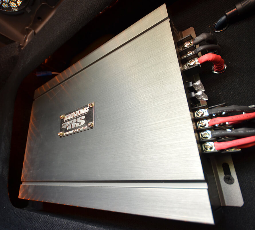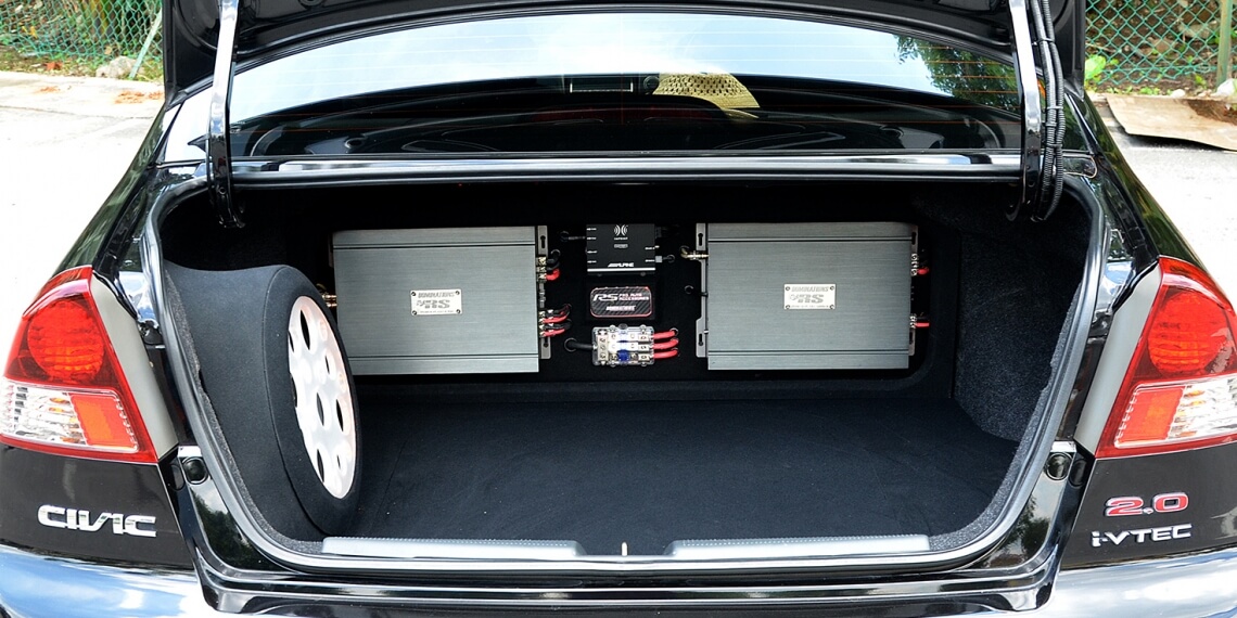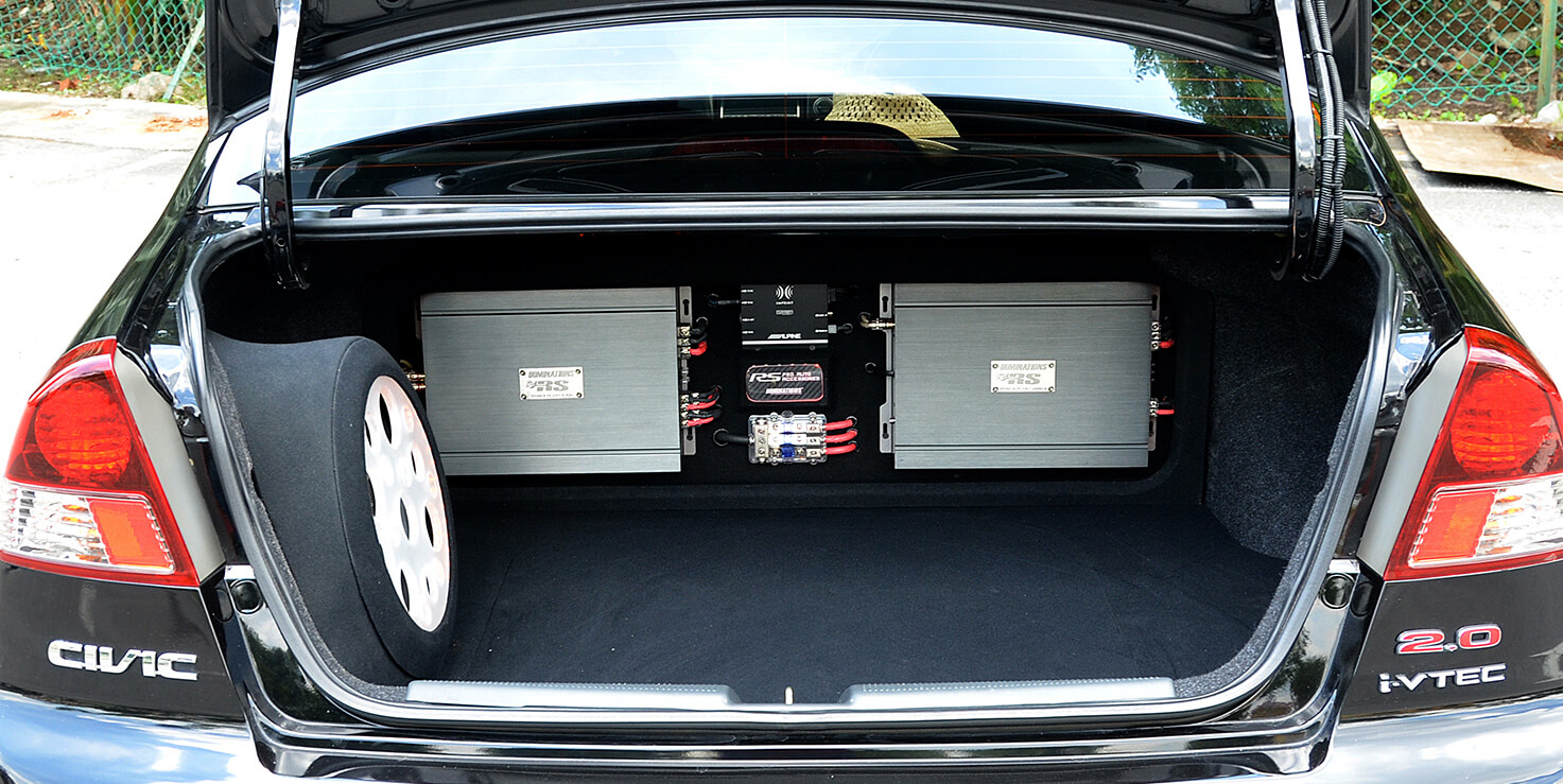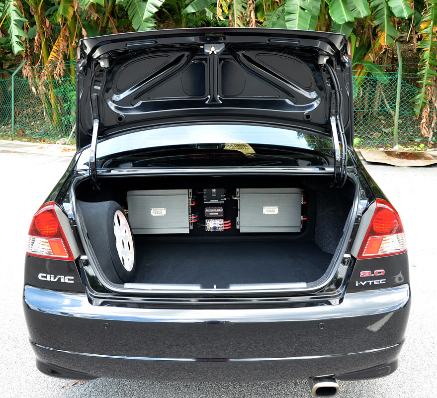Amplifier 4 channel Dominations dari Racing Series RS4300 digunakan sebagai aplikasi kuasa kepada unit staging hadapan. Seperti yang dapat dilihat dalam foto, sistem 2-way speaker asal kereta Civic ini digantikan dengan perkakasan speaker komponen 6” Dominations yang dipasangkan di bahagian panel pintu. Manakala tweeter Dominations pula ditempatkan di kedua belah A Pillar. Satu dari setiap channel ini menghantar sambungan kuasa kepada setiap unit speaker yang digunakan. Jelas, ‘distortion’ akibat masalah kekurangan kuasa bukanlah satu masalah.