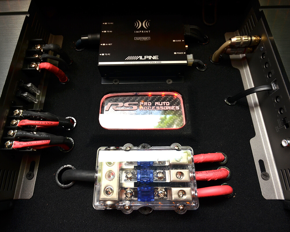 Pemain Alpine tadi disambungkan kepada pemproses Imprint PXA-H100 yang juga dari Alpine. Tidak dinafikan lagi, ini adalah pemproses yang boleh diharap bagi sistem pasif Alpine. Mungkin tidak sebagus rangkaian aktif yang lain, namun jika anda serius mahu kesan khas bunyi sehampir 5.1, alat kecil ini boleh membantu. Dari Imprint ini barulah signal dipecah dan diperkuatkan oleh 2 unit amplifier kelas AB dan D.