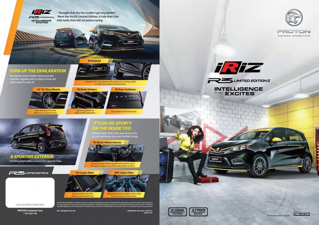 Di samping gaya dan kemewahan sebagai tujahan utama untuk model Edisi Hitam, Proton Iriz dan Saga R3 Edisi Terhad meraikan kejayaan Jabatan Sukan Permotoran PROTON. Lencana R3 sentiasa dikhususkan untuk model PROTON paling sporty dan kedua-dua Iriz serta Saga menjadi calon yang paling sesuai untuk moniker itu. Setiap kereta dicat dengan warna hitam dan dihiasi dengan warna yang dipakai oleh R3 yang tersendiri pada kereta lumba PROTON.