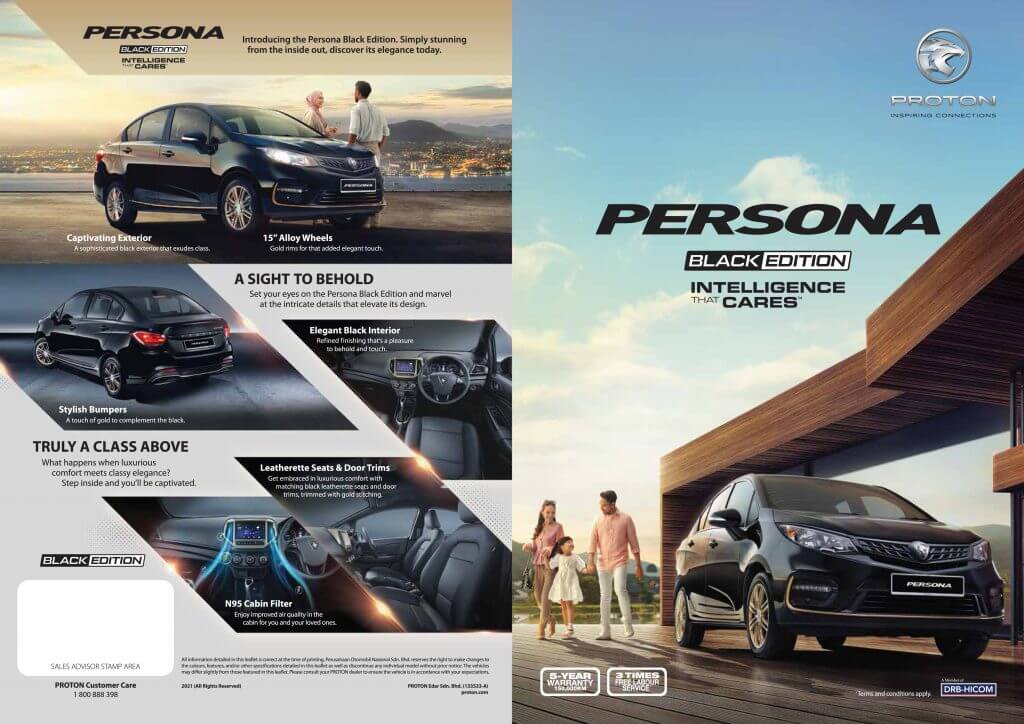 Menurut PROTON, model Persona dan Exora Edisi Hitam menambahkan gaya dan kemewahan pada kenderaan yang biasanya terjual berikutan ciri praktikal dan keselesaannya. Seperti nama yang dicadangkan, ia ditawarkan dengan warna hitam dan emas secara halus menyerlahkan lagi bampar dan roda aloi.