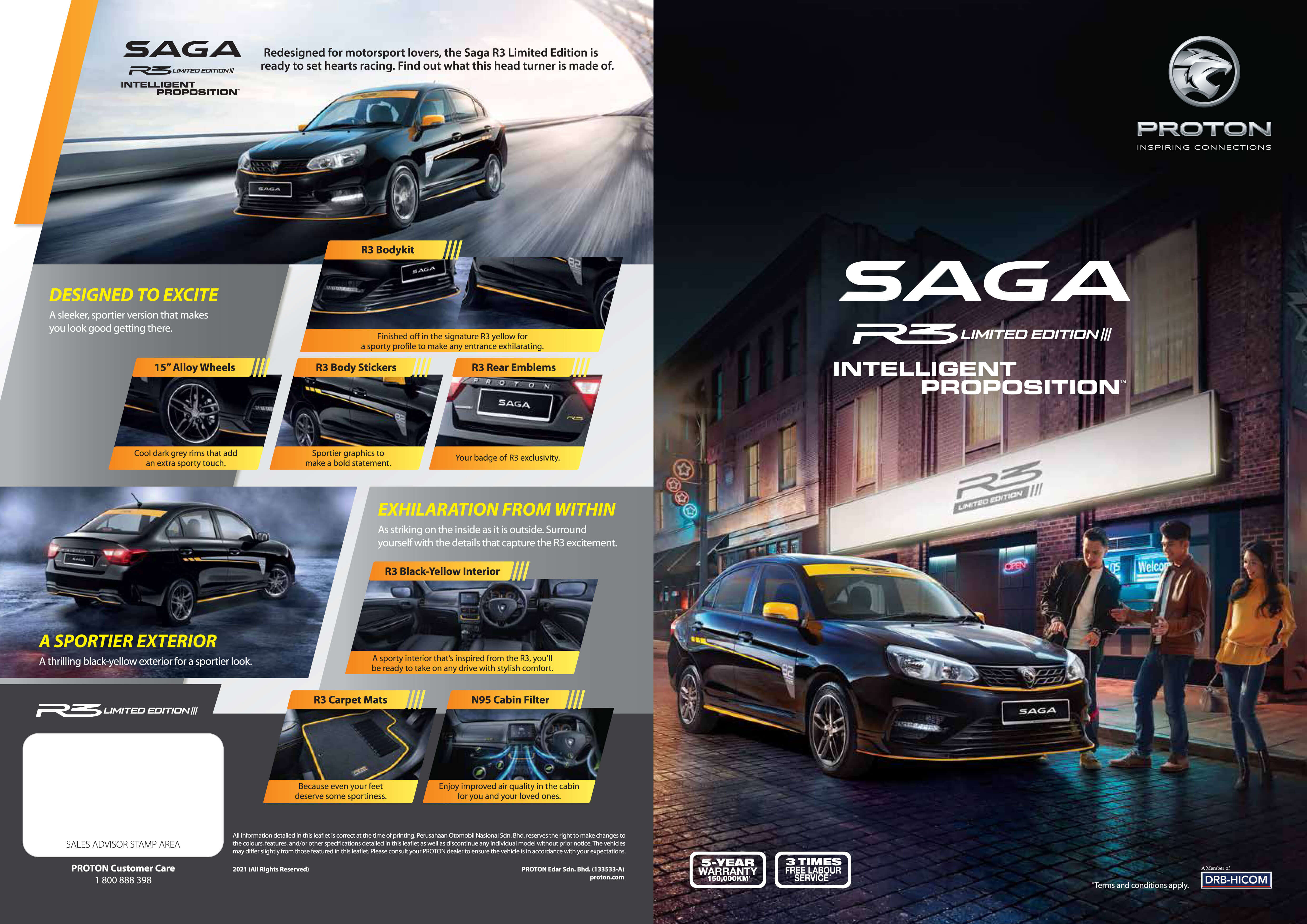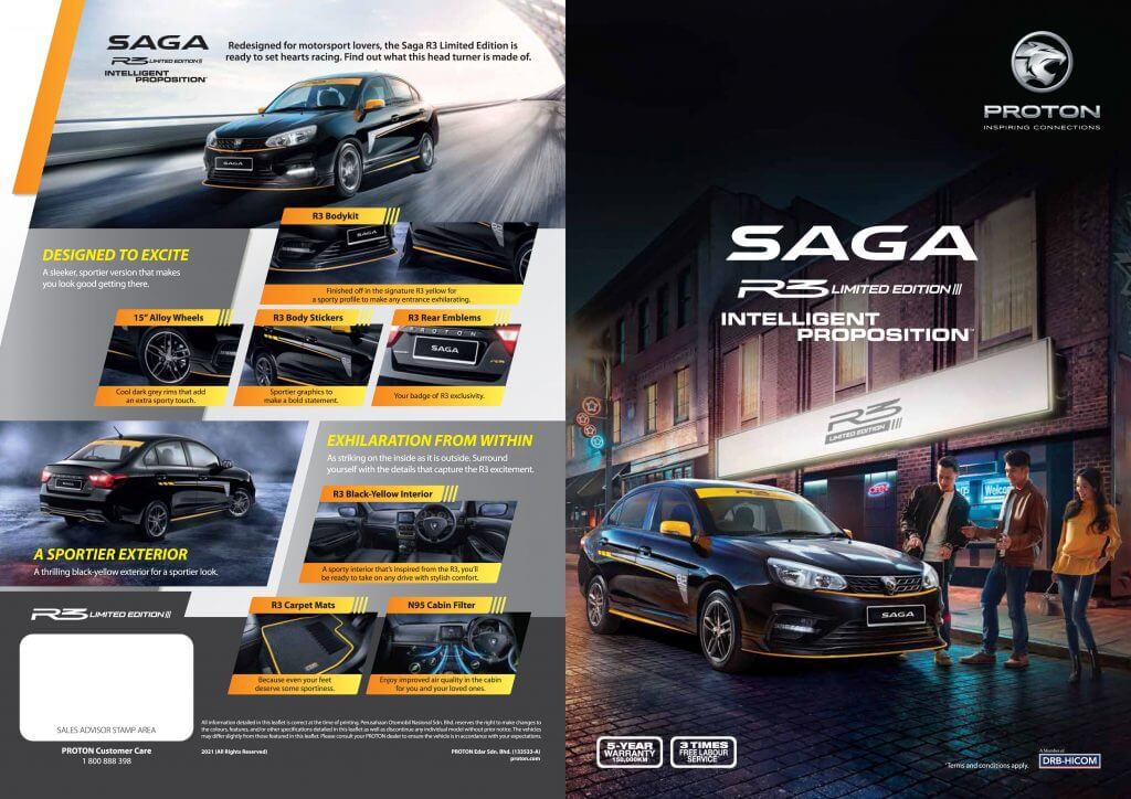 Bagi Proton Saga R3 edisi terhad, model sedan pilihan rakyat Malaysia itu ditawarkan pada harga atas jalan tanpa insurans RM42,300, manakala Iriz R3 pula RM52,900. Versi terhad Proton Persona dan Exora Edisi Hitam pula masing-masing ditawarkan pada harga RM54,700 dan RM67,800.