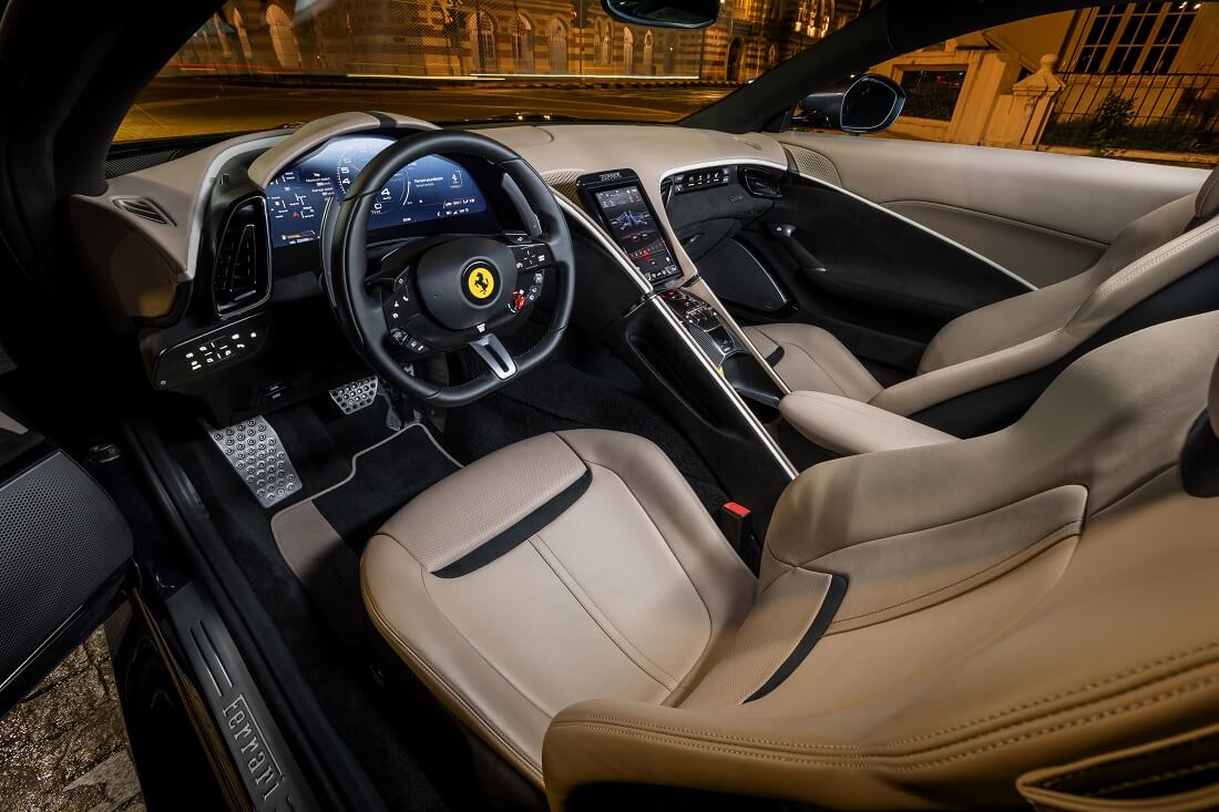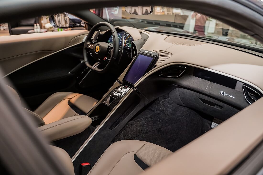 Rekaan aerodinamik di bahagian belakang juga memudahkan ia ‘memotong’ angin terutama ketika memecut. Ferrari Roma menawarkan konsep dwi kokpit menggabungkan kombinasi elegan dan sporty. Struktur simetri di ruang kabin memberi keselesaan kepada pemandu dan penumpang.