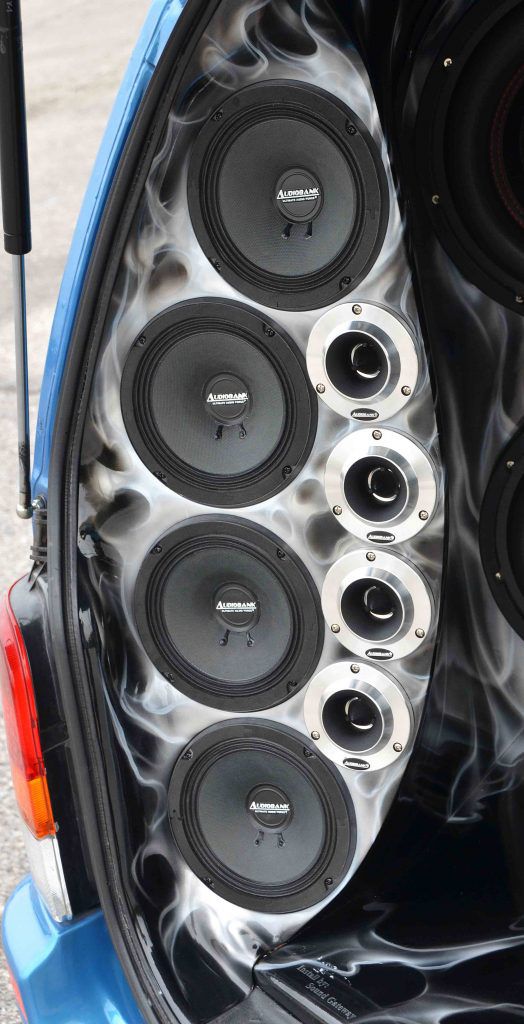 Kuasa yang setinggi itu disalurkan kepada 8 unit woofer Audiobank AB-P12D4 yang masing-masing mempunyai diameter 12”. Woofer ni mampu menampung kuasa sehingga 1000 watt RMS dan ia merupakan tarikan utama kepada keseluruhan sistem ni. Installer untuk projek kereta ni membina sebuah perumah khas yang memenuhi setiap ruang kargo dan jugak ruang tempat duduk belakang (yang sekarang dah tak wujud) bagi menempatkan subwoofer-subwoofer berkenaan.