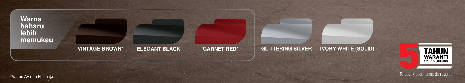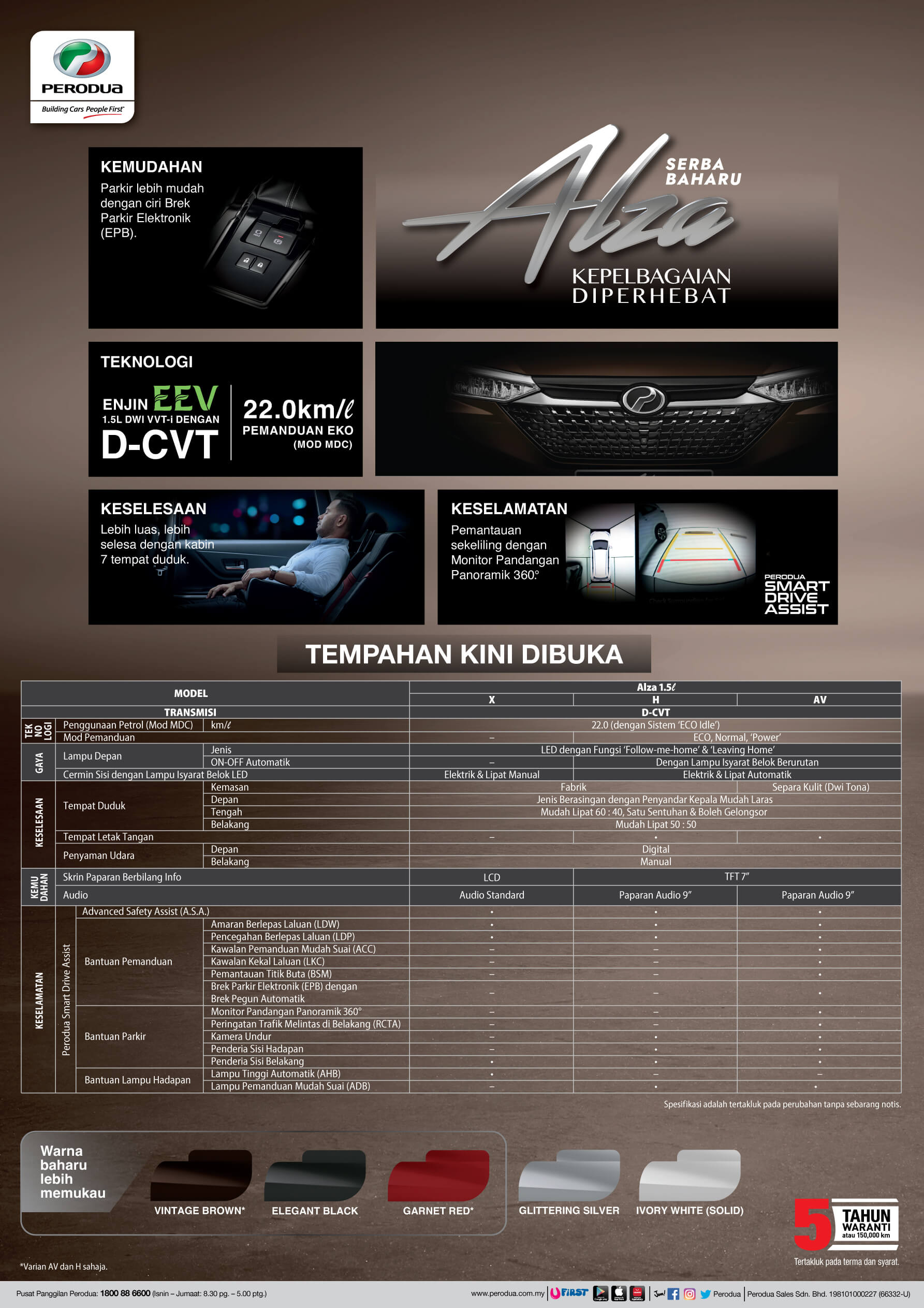 Tersedia dalam tiga varian, X, H dan AV; Perodua Alza Serba Baharu didatangkan dalam 5 warna: Ivory White, Glittering Silver, Garnet Red, Elegant Black (BAHARU) dan Vintage Brown (BAHARU).