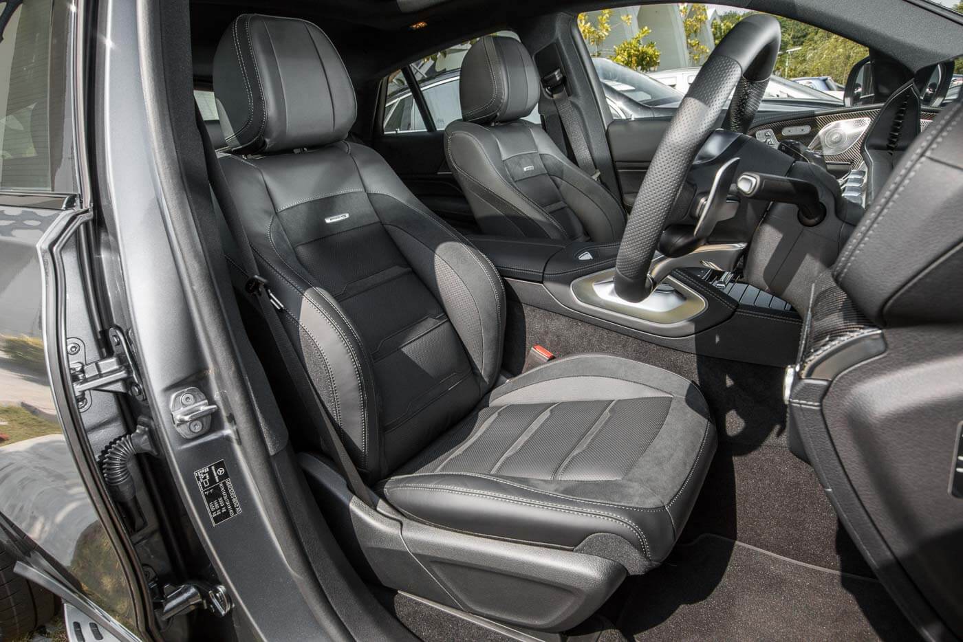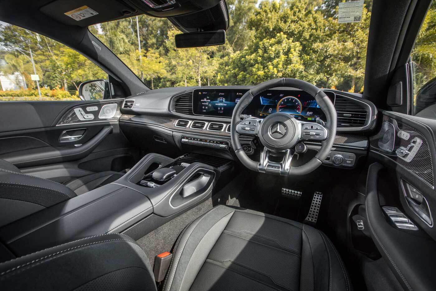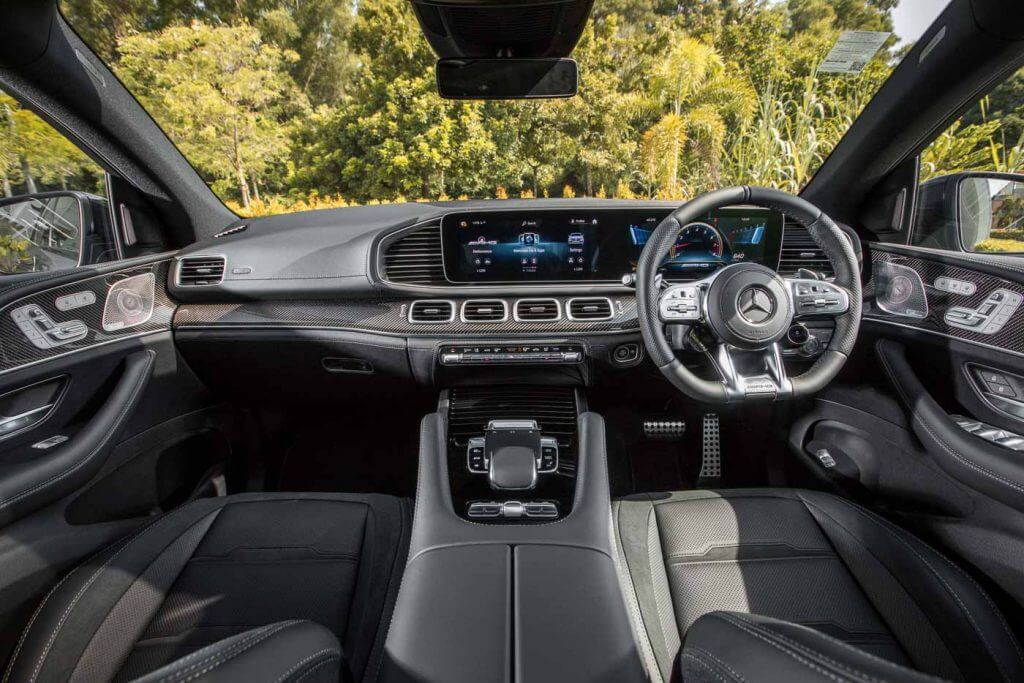 Ruang kabin pula dipasang dengan skrin berkembar 12.3 inci MBUX, sistem audio premium Burmester, ciri ketersambungan Android Auto dan Apple CarPlay, paparan head-up, slot pengecasan tanpa wayar, pakej AIR BALANCE, pencahayaan ambien, trim gentian karbon AMG, karpet AMG, pakej AMG Line, stereng AMG dibalut kulit nappa, sill panel AMG beriluminasi, tempat duduk larasan elektrik dengan fungsi memori dan kawalan suhu THERMOTRONIC.