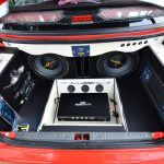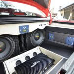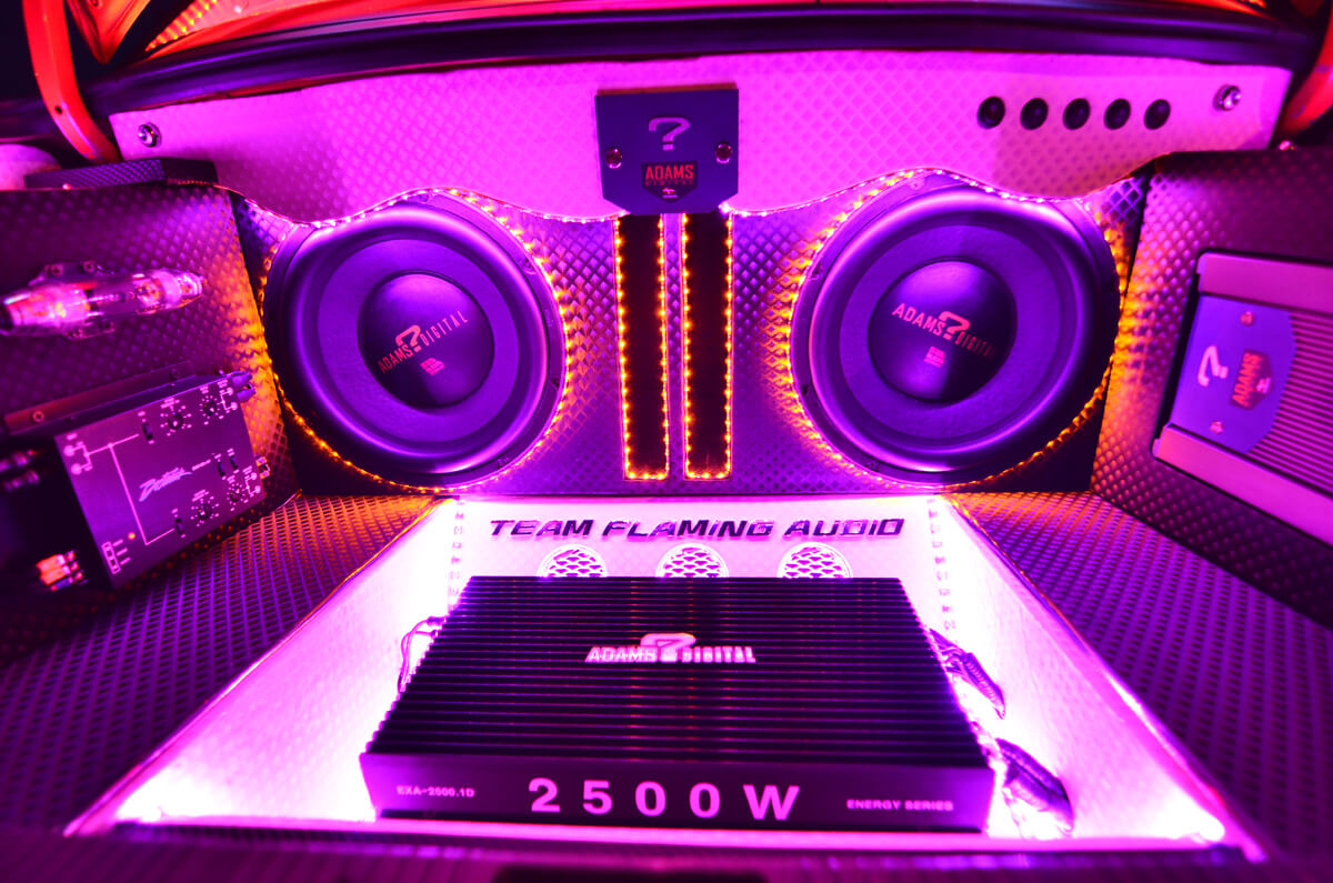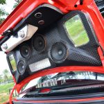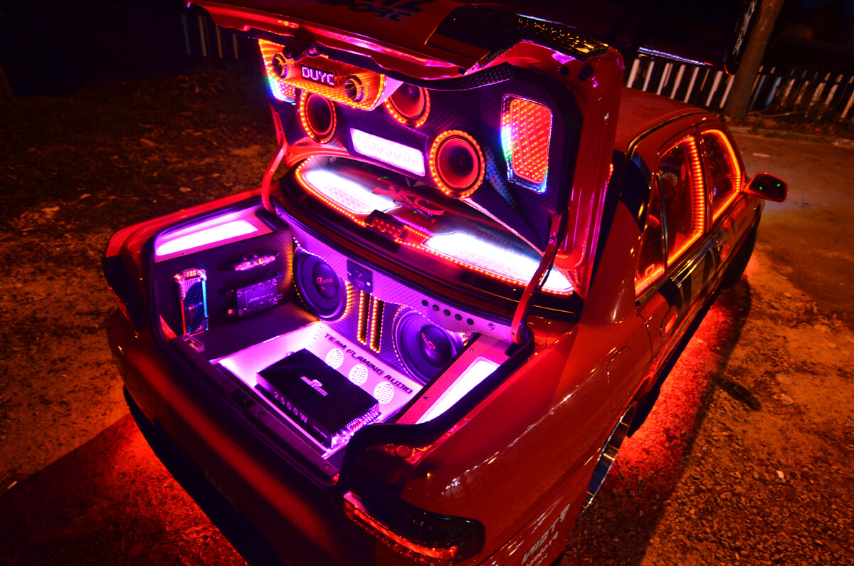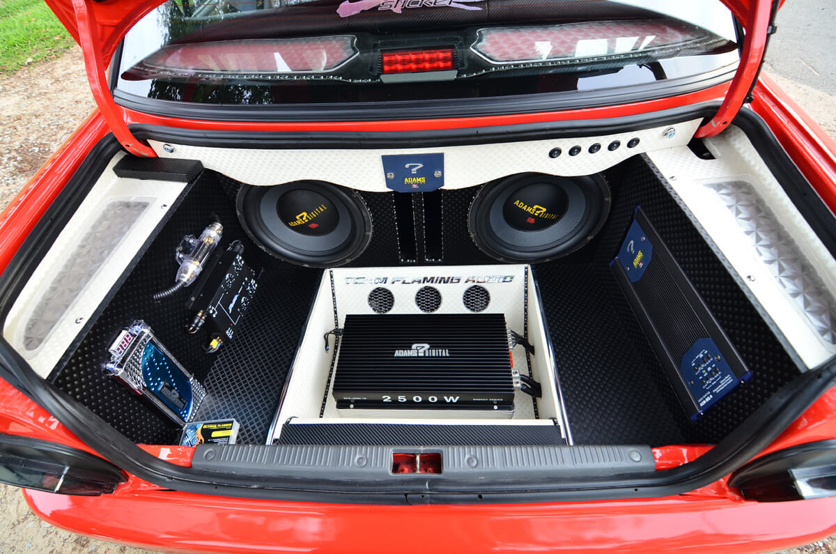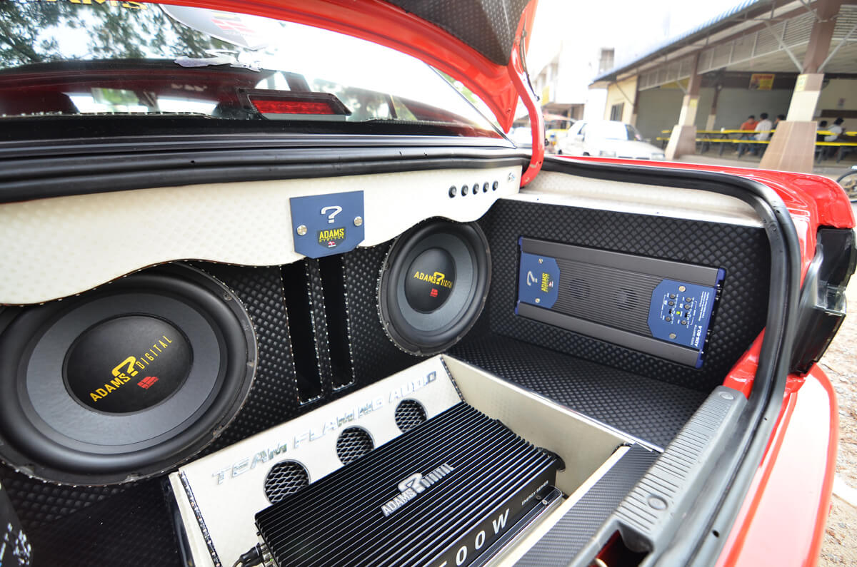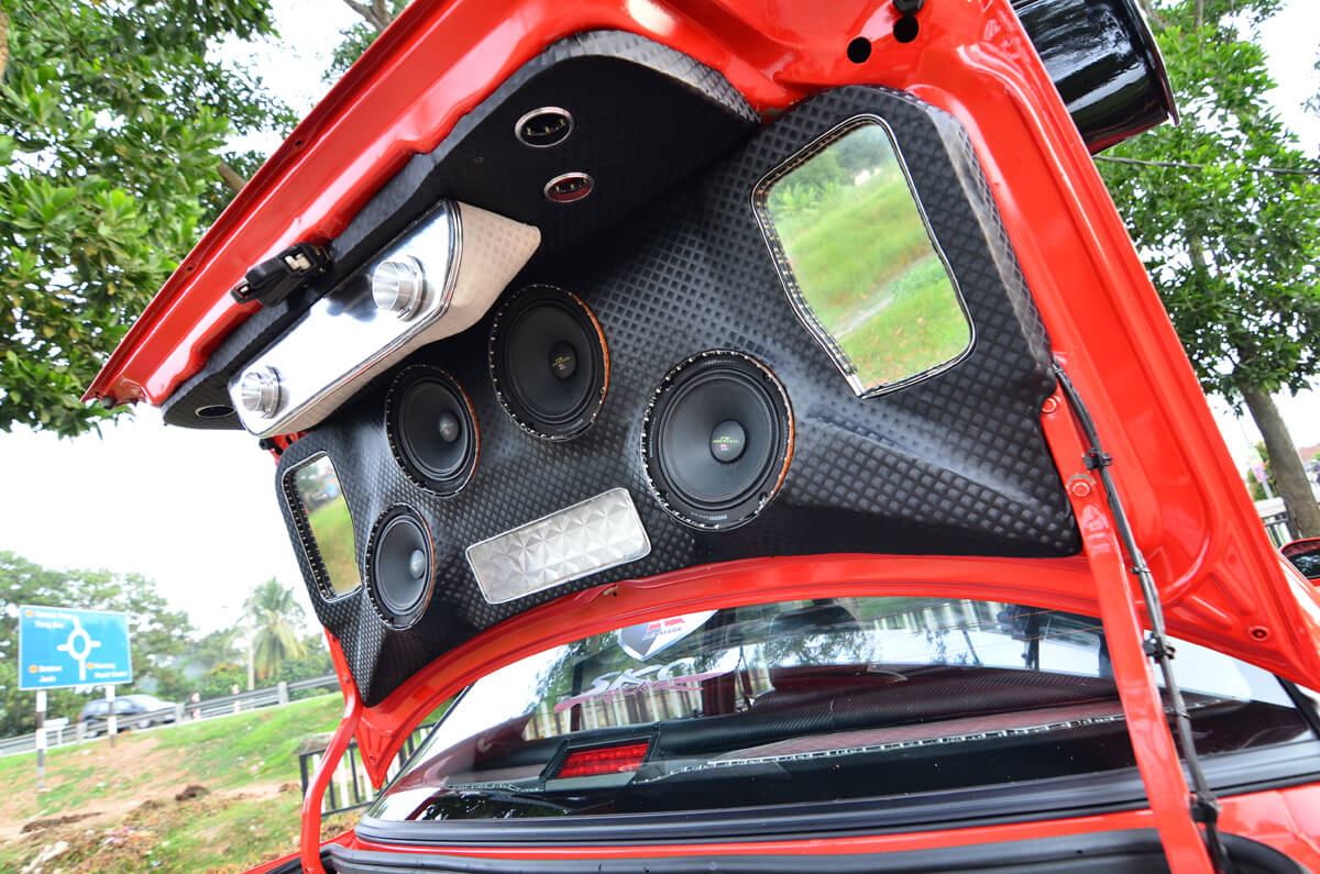 Pada bahagian ini dapat dilihat dengan jelas 2 unit woofer Adams Digital EX3000. Memandangkan ianya dibina untuk penyertaan dalam pertandingan, Duyong Flaming turut bertanggungjawab menyediakan sudut interior dan eksterior yang dipadankan dengan sistem audio ini, SPL. Bijak dalam penggunaan ruang, amplifier monoblock yang memacu 2 unit woofer tadi ditanam di tempat letak tayar simpanan serta digarisi beberapa lampu LED. Mungkin, ia tidak memberikan sebarang perbezaan, tetapi Wira ini sangat menyerlah ketika di waktu malam.