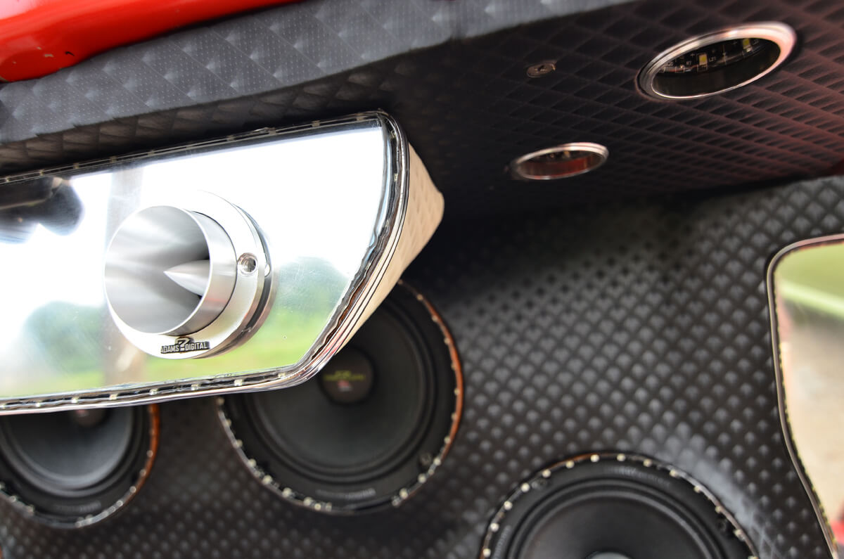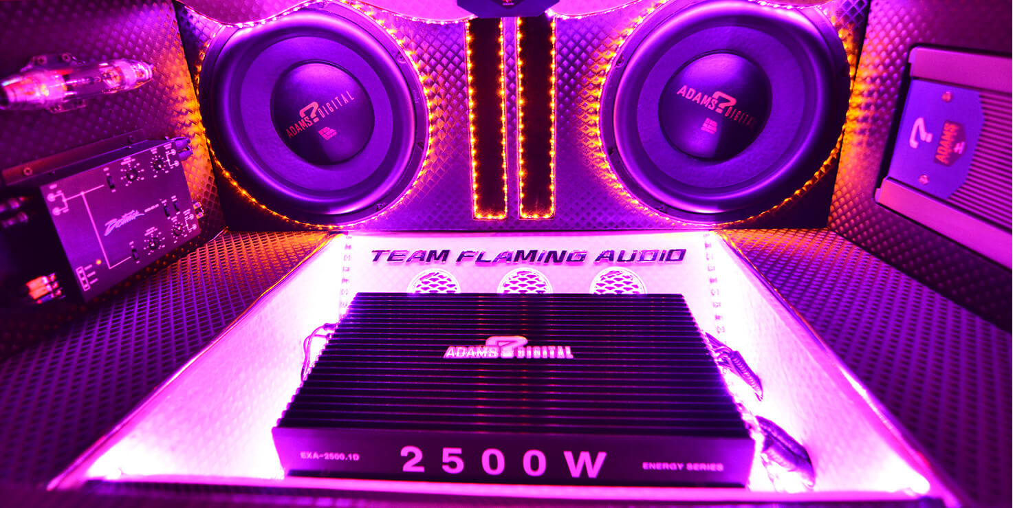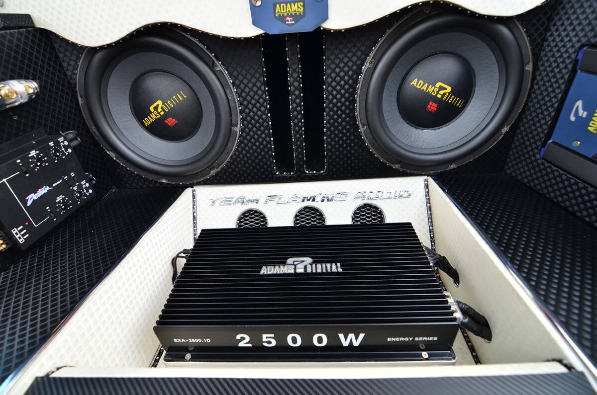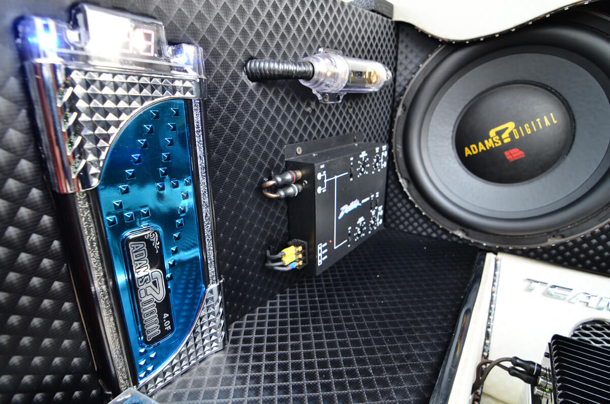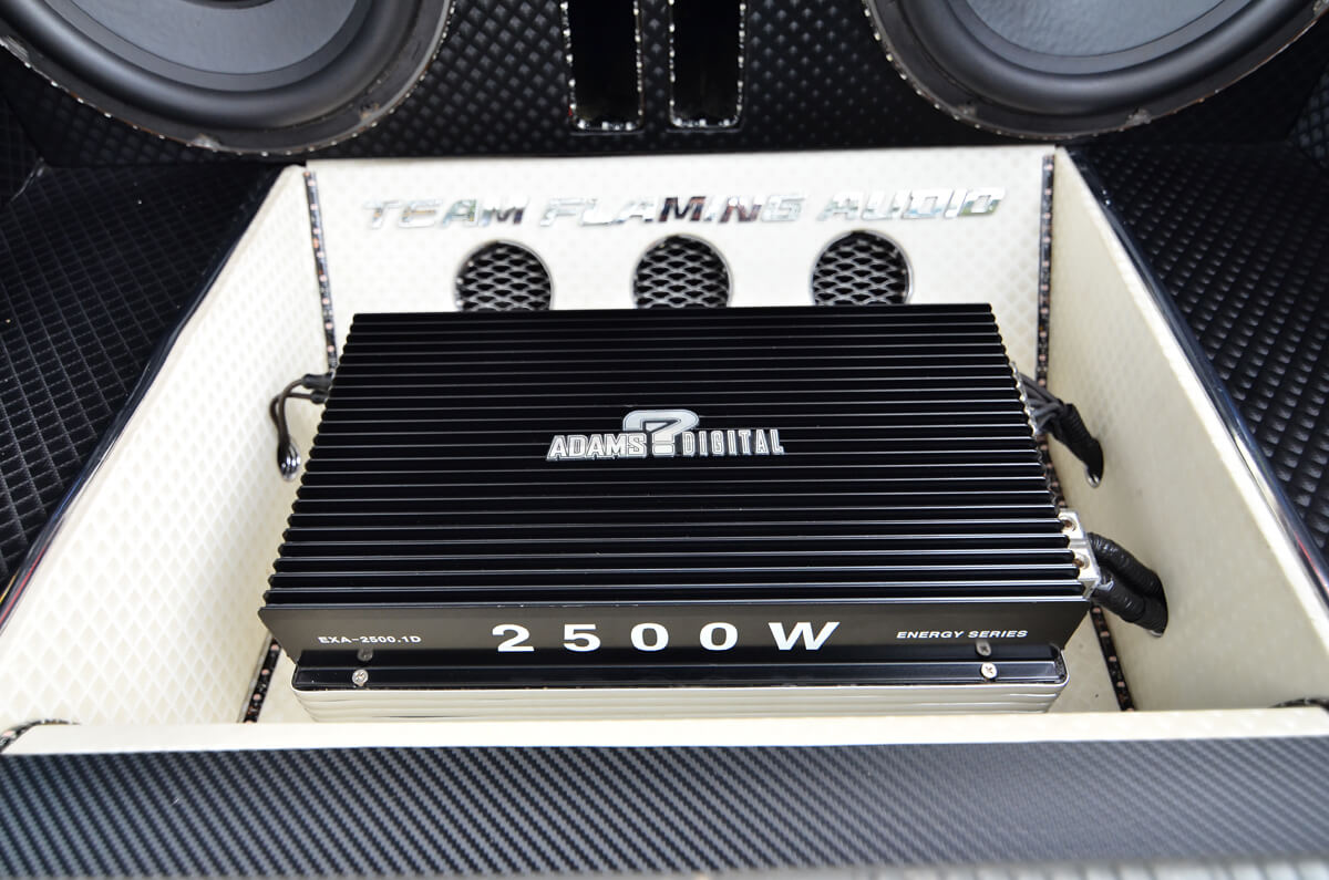 Dari crossover ini, isyarat dibahagikan pula kepada dua laluan yang terdiri daripada seunit amplifier 4 channel Adams Digital ADS-80.4 dan seunit amplifier monoblock Adams Digital EXA-2500.1D. Amplifier 4 channel ini memacu 4 unit mid bass 6” Adams Digital dan 2 unit tweeter yang juga dari Adams Digital. 4 unit mid bass dan diikuti dengan 2 unit tweeter ini ditempatkan di bahagian but belakang. Disusun secara teratur untuk memastikan staging bunyi yang dihasilkan adalah tepat. Kenapa hanya 2 tweeter? Ia adalah untuk memberikan frekuensi tinggi dan diseimbangkan dengan kebulatan bunyi bass dari mid dan juga woofer.