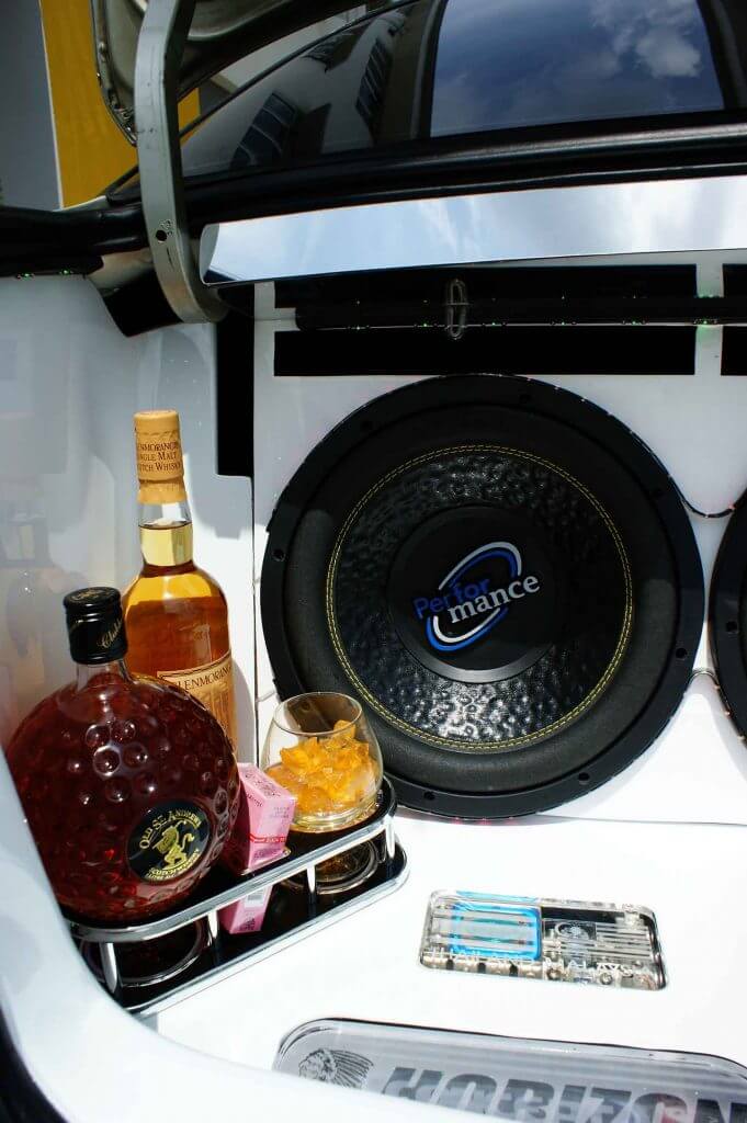 Bahagian but yang dilengkapi dengan peralatan Performance ini tidak dibiarkan sahaja. Kontras dengan ruang kokpitnya yang kelihatan seperti keluaran kilang. Bahagian but menampilkan jalinan warna putih dari salutan PVC, lapisan perspek menutup amplifier serta sebuah monitor LCD yang dipasangkan terus di tengah-tengah boot lid. Sebagai tambahan, tetamu ’dihidangkan’ dengan minuman keras sebagai gimik yang biasa kelihatan pada kereta-kereta bertemakan VIP.