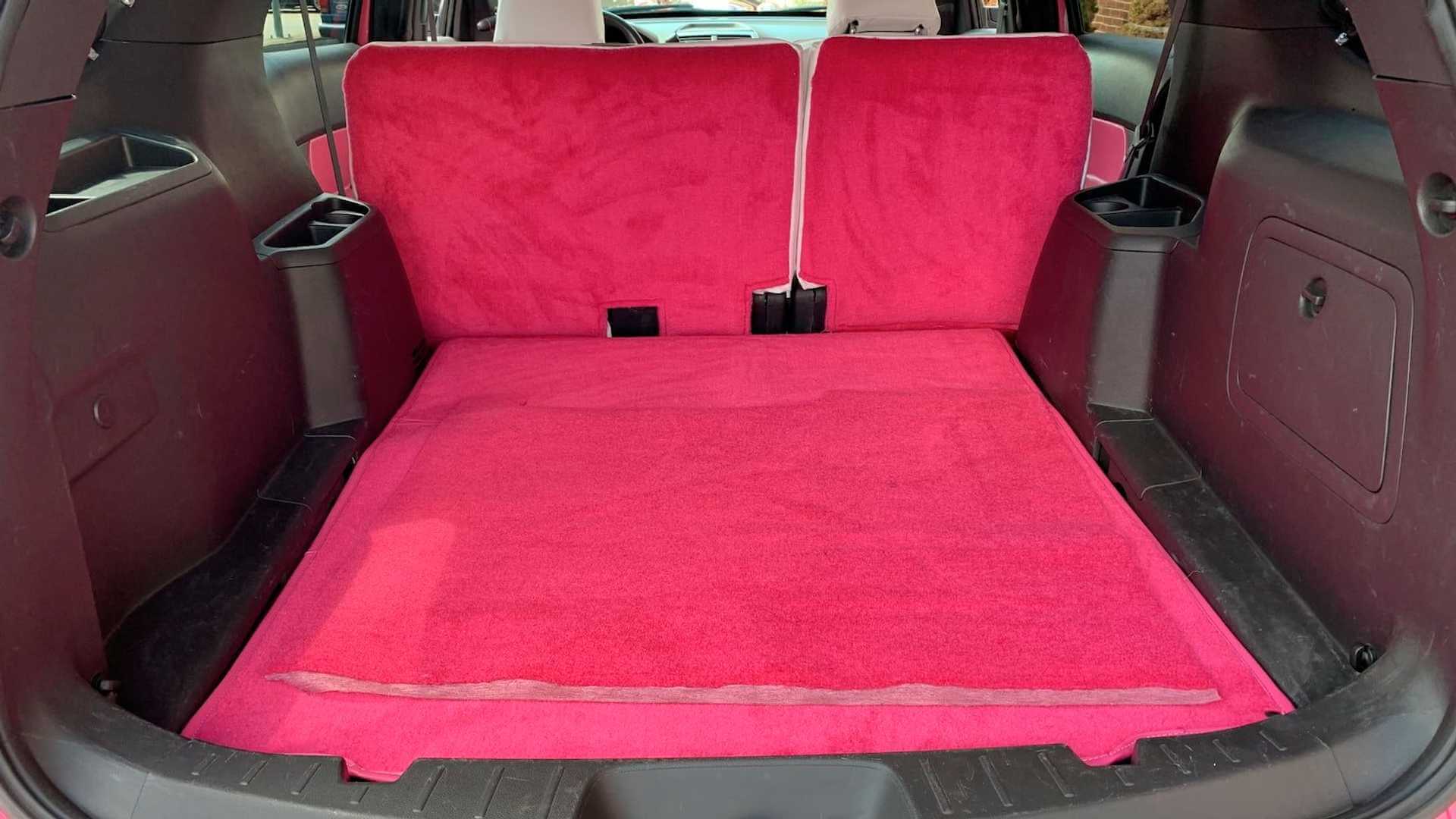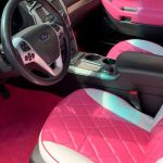 Tunggu dulu, bukan setakat bahagian luarnya sahaja diwarnakan dengan hot pink. Bahagian dalam juga tidak ketinggalan. Semuanya dilengkapi dengan warna hot pink pada panel pintu, tempat duduk dan begitu juga pengalas kaki. Mujur bahagian tengah tempat duduk diselitkan kulit berwarna putih.