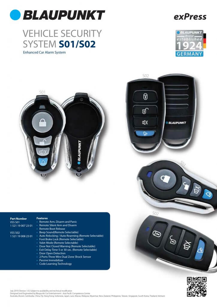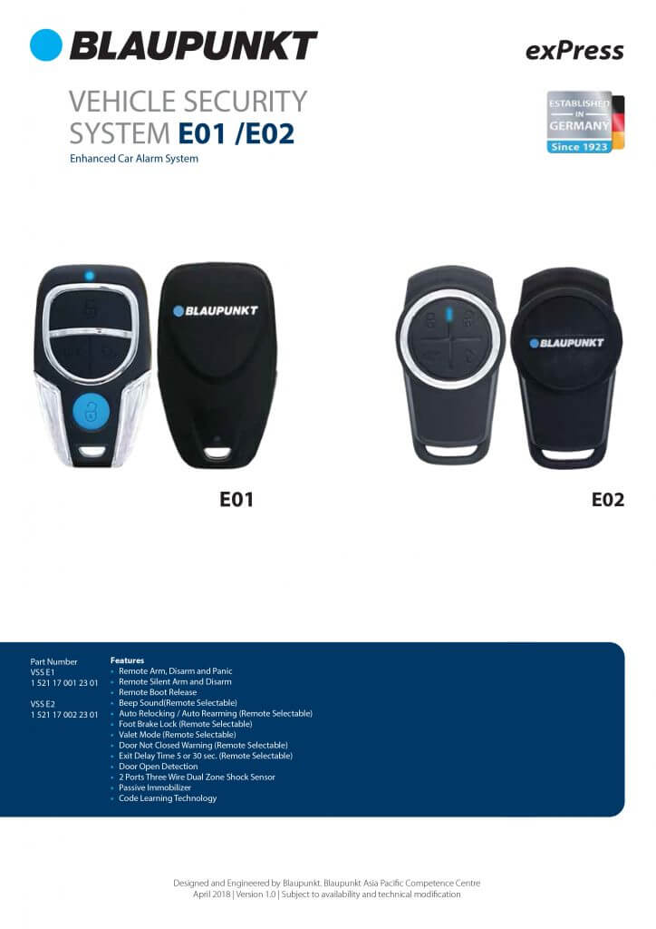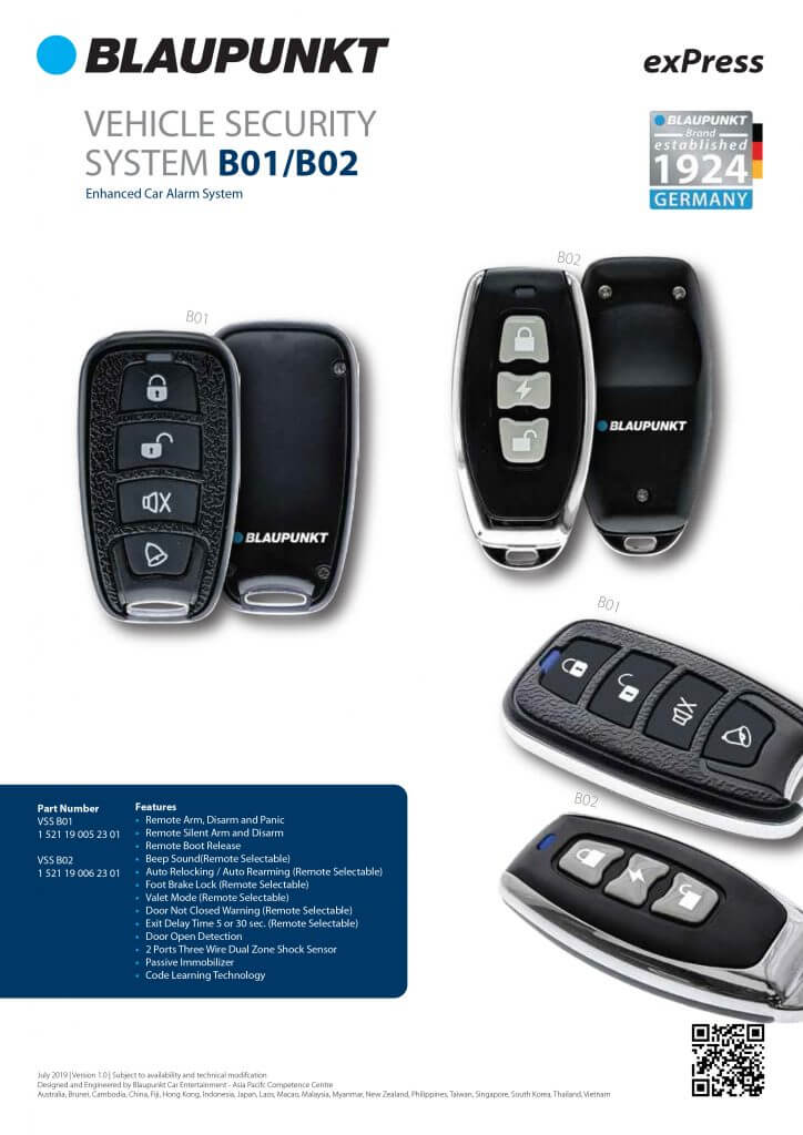Sistem penggera keselamatan dari Blaupunkt direka cukup ringkas, namun memberikan perlindungan jauh lebih baik serta selamat dan melindungi pengguna dari ancaman perompak yang cuba merompak. Terdapat tiga jenis sistem sekuriti kenderaan yang ditawarkan oleh Blaupunkt iaitu sistem sekuriti kenderaan B01/B02, sistem sekuriti kenderaan E01 /E02 dan sistem sekuriti kenderaan S01/S02.
