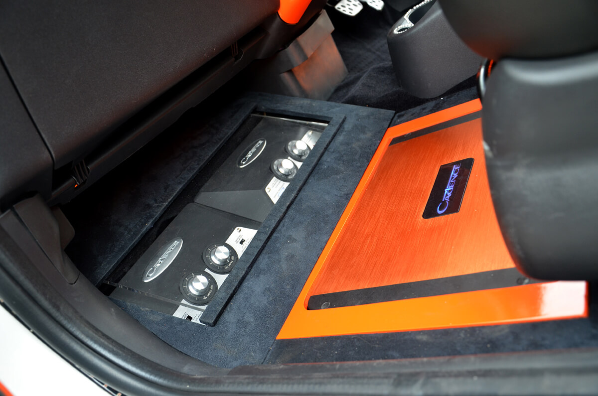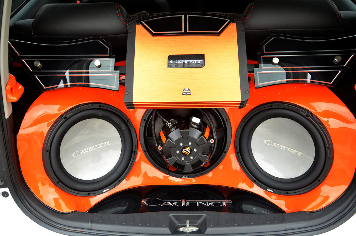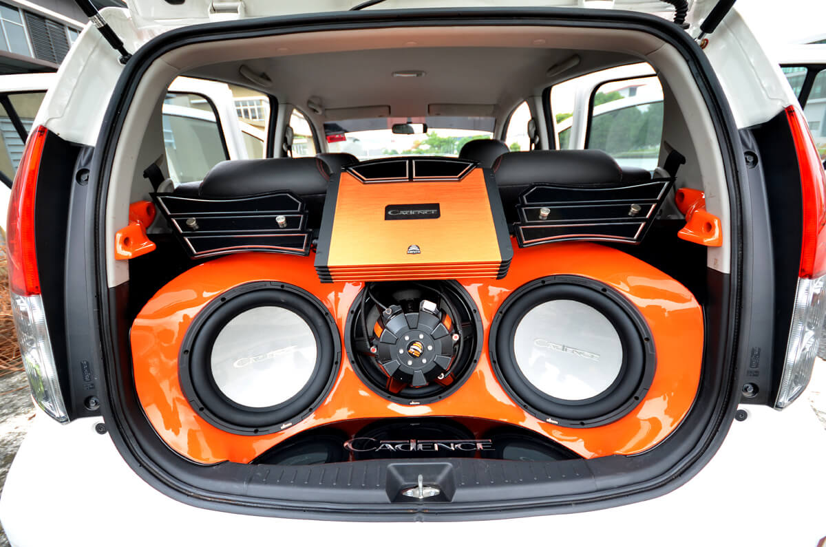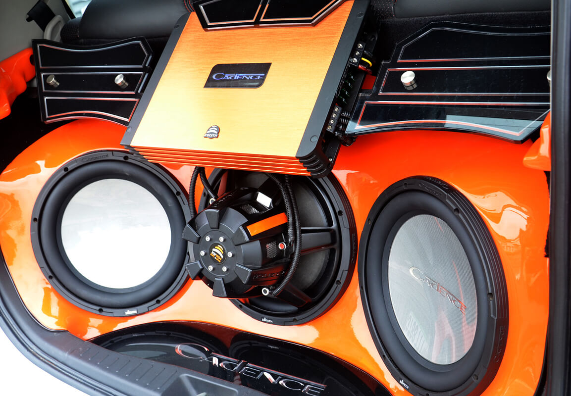 Sekarang masa untuk melihat keunikan bahagian butnya. Satu perkara yang pasti, banyak masa dan usaha untuk merekebantuk posisi penempatan komponen audio dengan konsep begitu. Pertama sekali ialah tiga unit woofer dipasangkan secara bersilang. Dua menghala ke luar dan satu di tengah dipasang reverse. Setiap satu daripada woofer 12” Cadence Xenith XW12D4 ini menerima kuasa dari amplifier monoblok masing-masing. 3 amplifier Cadence Xenith XA1200.1D untuk 3 woofer. Memang terbaiklah dan sangat ‘constant’ bunyinya.