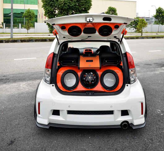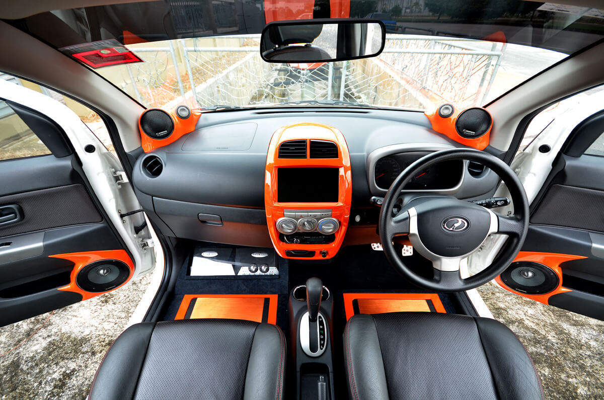 Apa yang menjadikan Myvi ini berbeza dengan kebanyakan kereta yang pernah disiarkan ialah konsep pemasangan dan tema yang unik. Amplifier di lantai dan warna-warna perumah oren yang menyerlah.