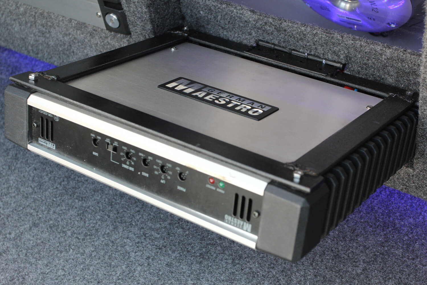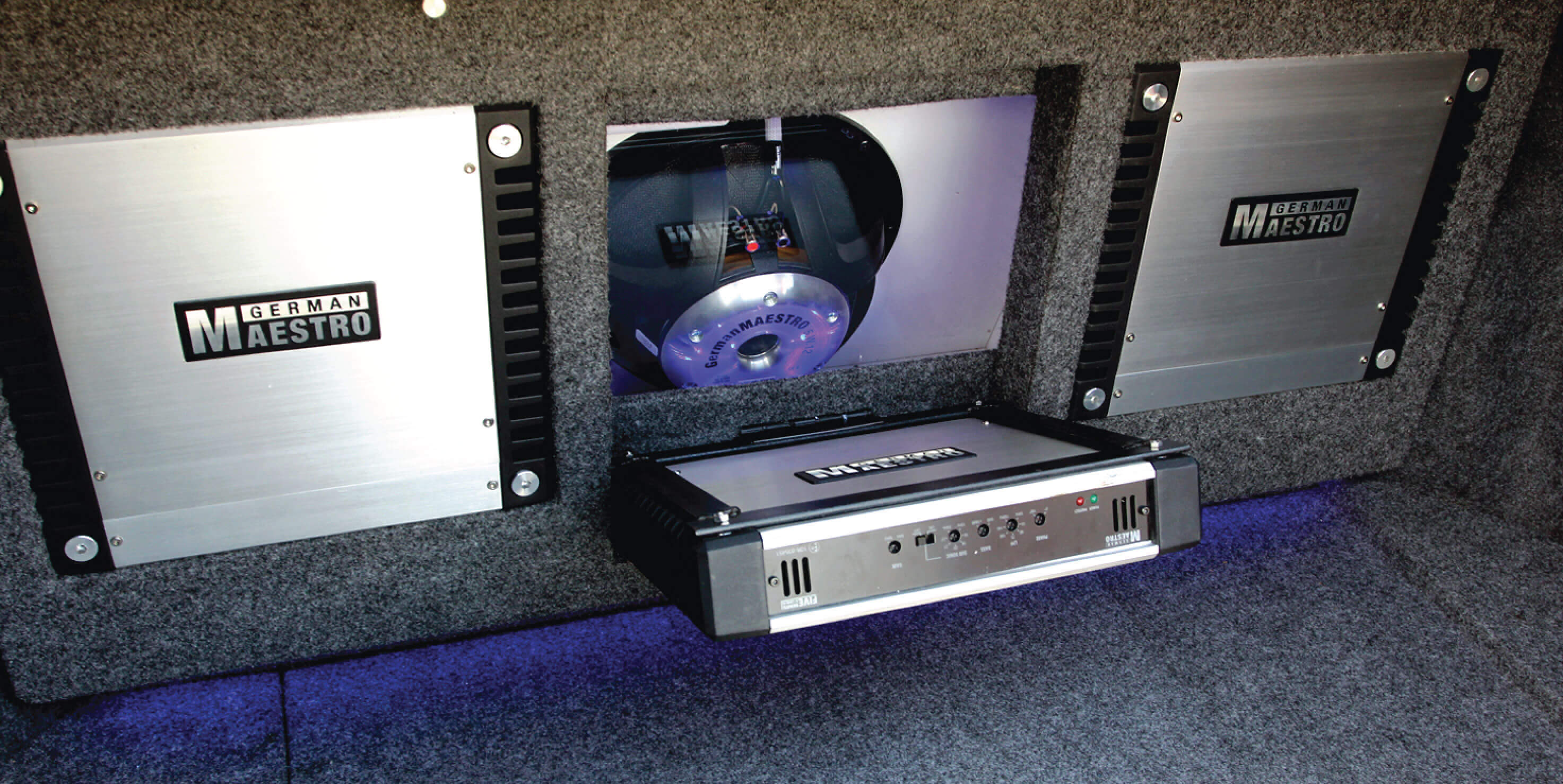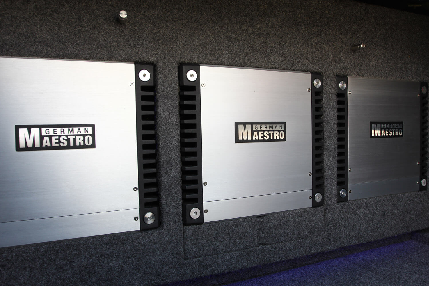 Sebagaimana jenama audio yang datang dari Jerman, GermanMaestro bukanlah satu jenama yang dilambakkan sesuka hati dan mudah didapati di mana-mana sahaja. Setiap satunya dibina menerusi kerja tangan yang sangat halus dan teliti. Kualitinya seringkali dipantau agar membawa reputasi yang sama di setiap produk keluarannya. Tidak kiralah, sama ada speaker mahupun barisan amplifier. Justeru itu, bagi memberikan definisi audio terbaik, 2 jenis amplifier GermanMaestro digunakan; amplifier 4 channel German Maestro Five Series AB-4.85.10 sebanyak 2 unit dan satu jenis lagi amplifier monoblock GermanMaestro Five Series D1.1000.10.