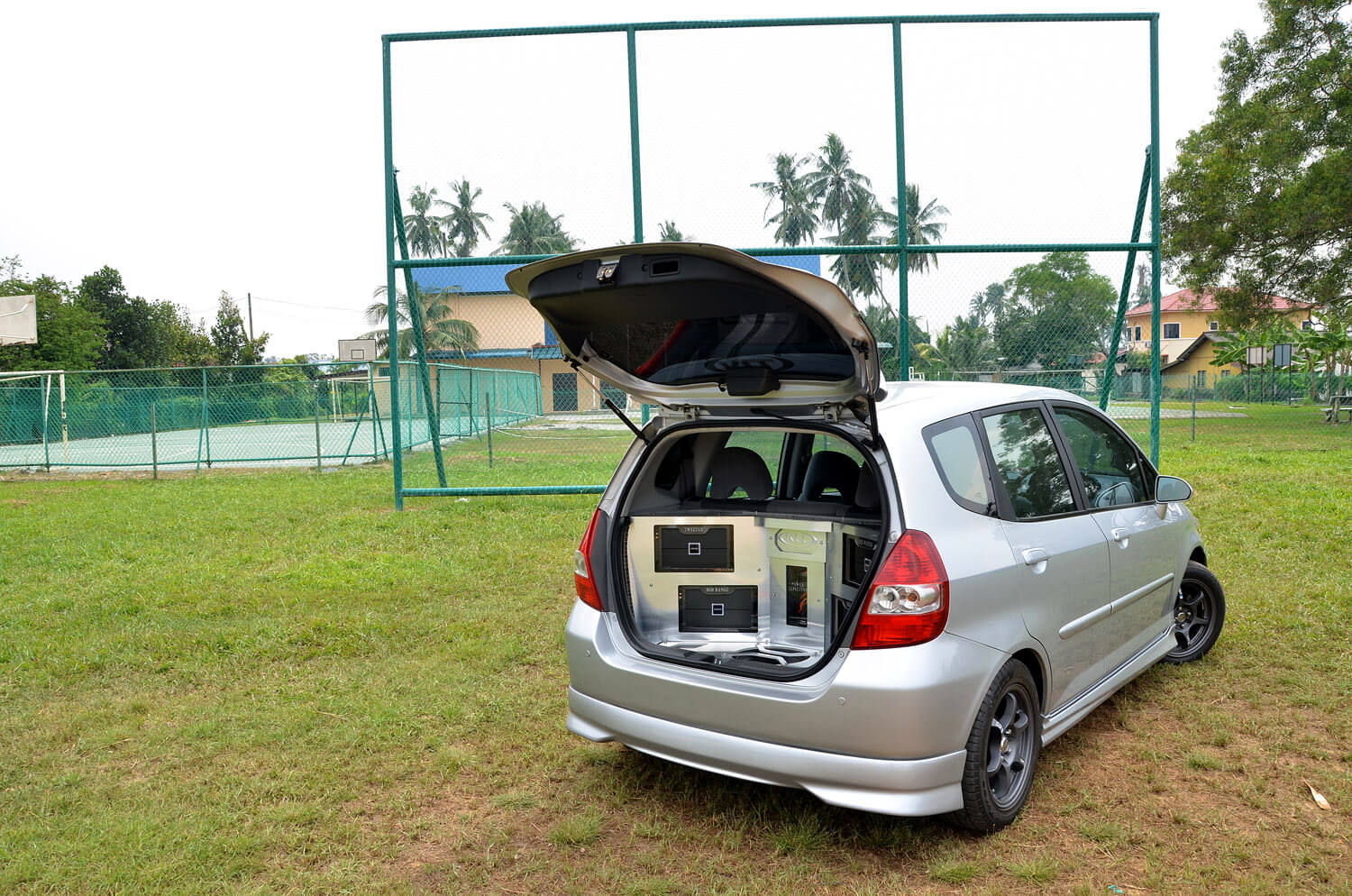 Kereta ini juga mendapat perhatian bagi kaki audio. Kami menemui sebuah Jazz yang diubahsuai dengan penempatan sejumlah peralatan agak banyak. Ditemui di Klang berhampiran kawasan desa, kereta ini menerima penalaan yang menyeluruh di salah sebuah lokasi ‘rahsia’ peminat audio SPL. Namun begitu, kereta ini bukanlah binaan SPL, sebaliknya sebuah sistem SQ tiga hala yang dibina dari produk jenama Target Audio dan Coral.