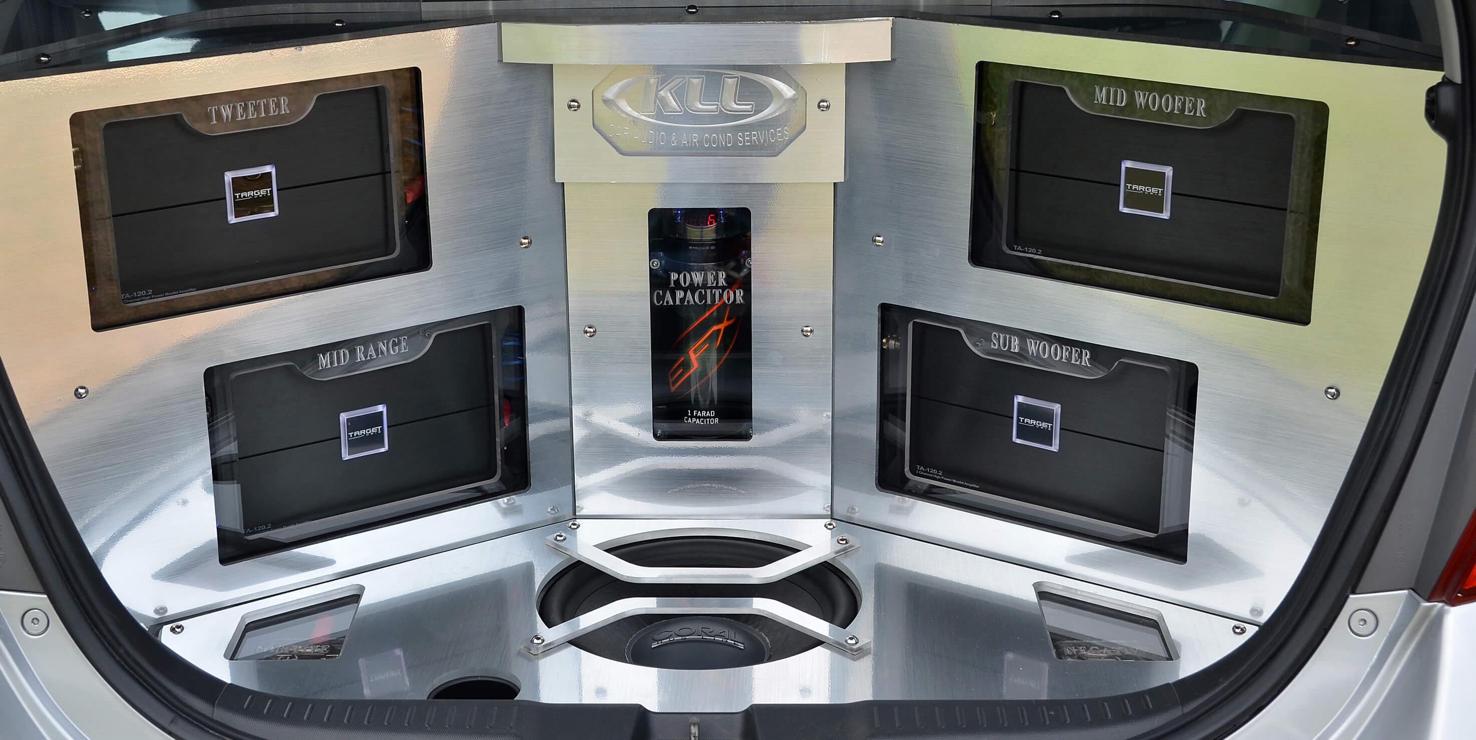 Seunit woofer 12” jenama Coral mengakhiri senarai komponen audio yang digunakan. Turut mendapat kuasa daripada amplifier 2 channel Target Audio TA-120.2, woofer ini dipasangkan betul-betul di atas lantai but belakang bersama dengan kesemua unit amplifier dan seunit power cap 2.0 farad.