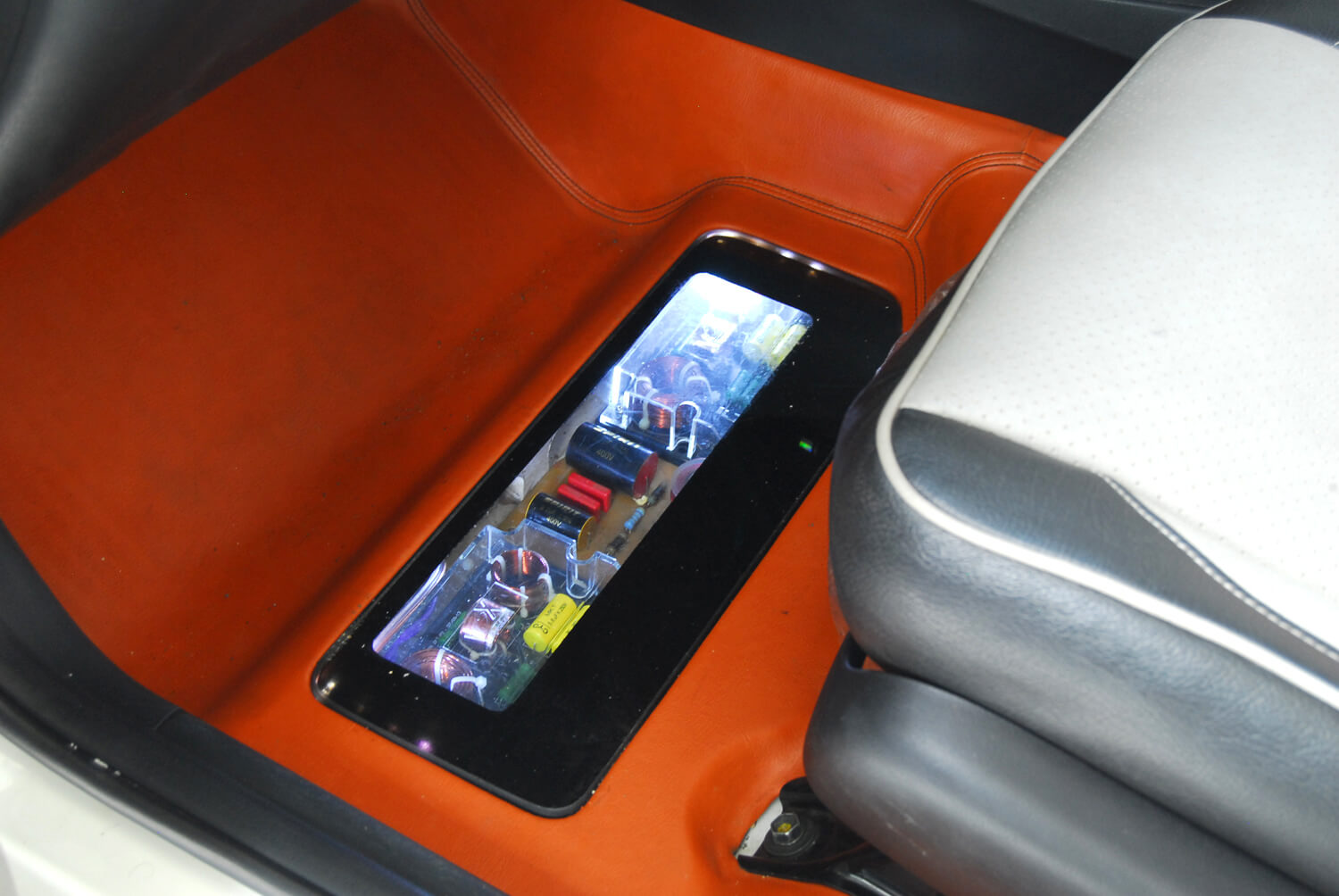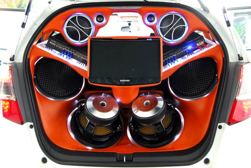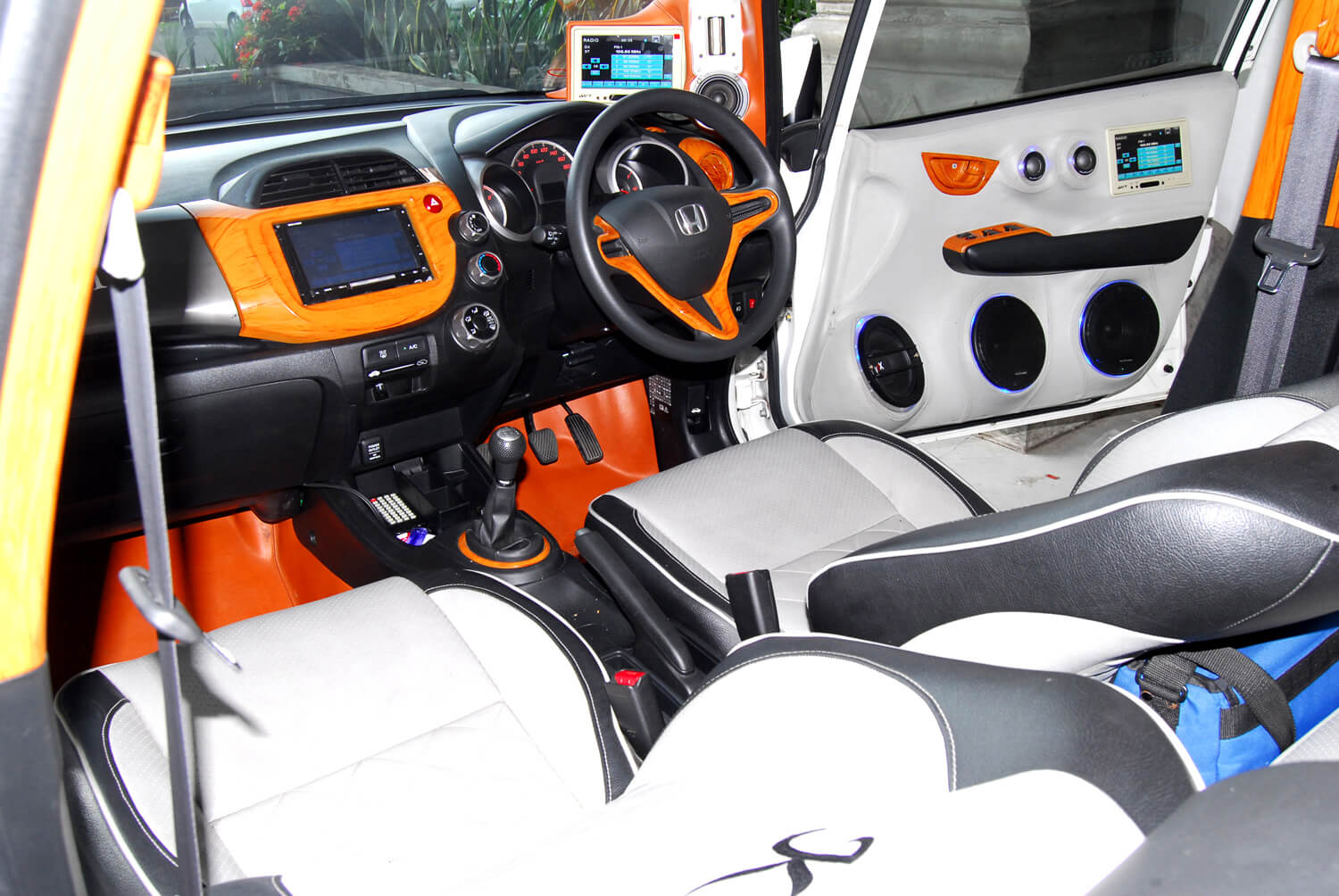 Dimulakan pemain utama 2-din membaca data media dan menterjemahkan ianya sebagai isyarat yang dialirkan kepada 3 unit amplifier. Kesemua amplifier yang bertugas memacukan barisan speaker, sama ada di bahagian kokpit dan juga bahagian bonet kereta. Berbeza dengan kereta-kereta yang pernah ditemui sebelum ini, Jazz sentuhan Wisnu ini memenuhi setiap bahagian. Bahagian dalam sahaja dibahagikan kepada 2, kokpit dan tempat duduk penumpang belakang.