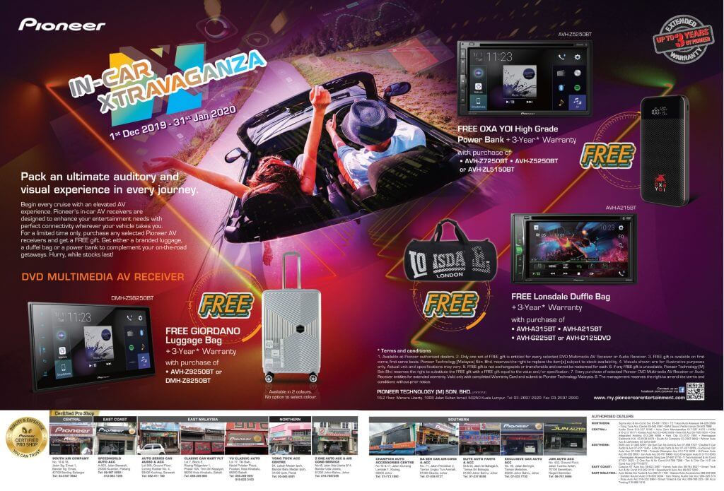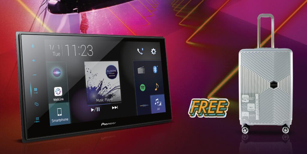 Bukan itu sahaja, anda juga berpeluang membawa pulang hadiah-hadiah menarik. Dengan setiap pembelian pemain utama AVH-Z9250BT atau DMH-Z8250BT, anda boleh membawa pulang sebuah bagasi Giordano percuma dan waranti selama 3 tahun. Manakala untuk setiap pembelian mana-mana pemain utama AVH-Z7250BT, AVH-Z5250BT atau AVH-ZL5150BT anda akan dapat sebuah power bank OXA Yoi secara percuma dan waranti selama 3 tahun.