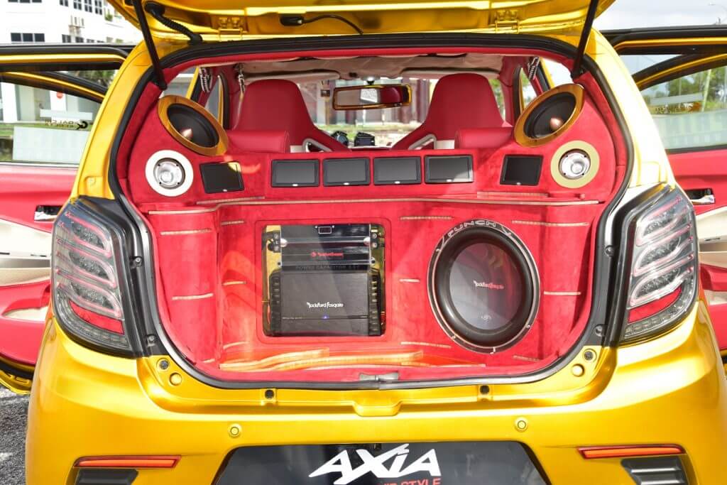 Chik Jan telah menghantar kereta Axia miliknya ini ke kedai H-Two Audio Wiring bagi tujuan pemasangan sistem audio. Bagi makluman, sistem audio ini dibahagikan kepada dua; dalam dan juga di bahagian belakang. Sebanyak 4 unit mid bass 6 inci dari KLM Audiospeaker dan 2 unit coaxial speaker Morel telah dipasangkan. Bagi sistem audio di bahagian dalam, sebanyak 2 unit mid bass digunakan dan setiap satunya dipasang di setiap panel pintu di bahagian hadapan. Manakala 2 unit coaxial speaker pula dipasangkan di panel pintu bahagian belakang. Melengkapi sistem audio di bahagian ini, dua unit tweeter berukuran 1.5 inci dari Morel dipasangkan di pillar A.