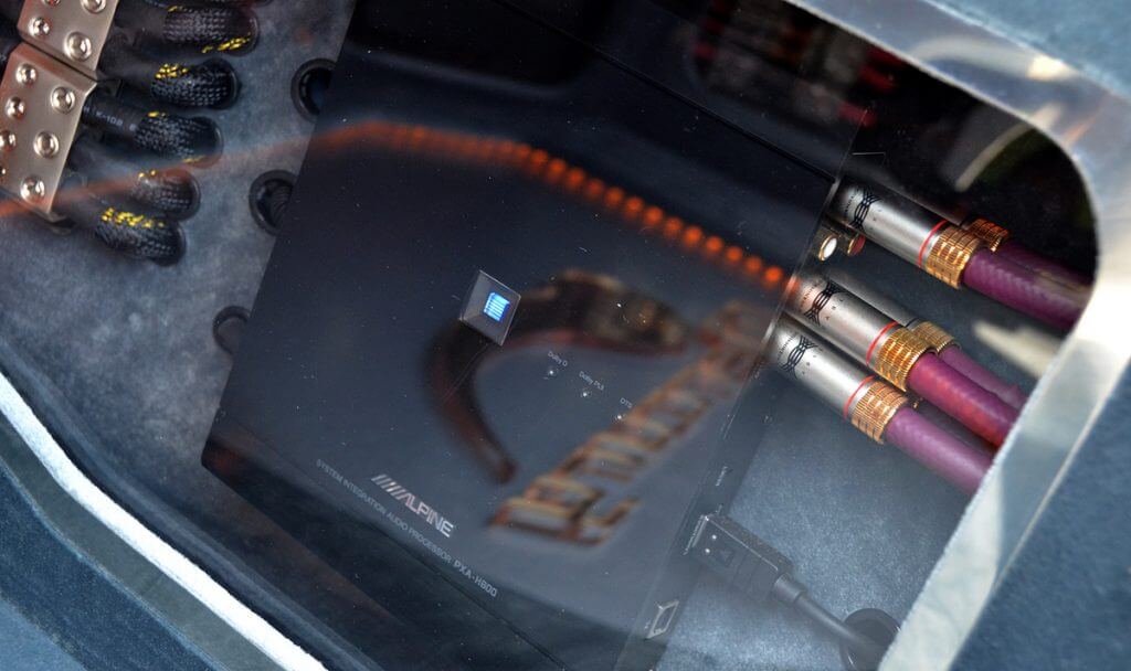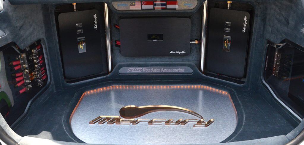 Pemproses ini dipasangkan dengan tiga unit amplifier Mercury. Satu saja sudah berapa harganya? Inikan pula tiga! Amplifier tersebut terdiri daripada 2 unit amplifier tiub 4 channel Mercury MCR-T4080 dan seunit amplifier kelas D monoblock Dominations Mercury MCR-800.1. Unit-unit ini dipasangkan dengan cukup bergaya di bahagian but bersama kotak fius dan pemproses PXA-H800 tadi. Jika anda ada sesuatu yang mahal untuk dipasang, kenapa perlu disembunyikan? Ya tak?