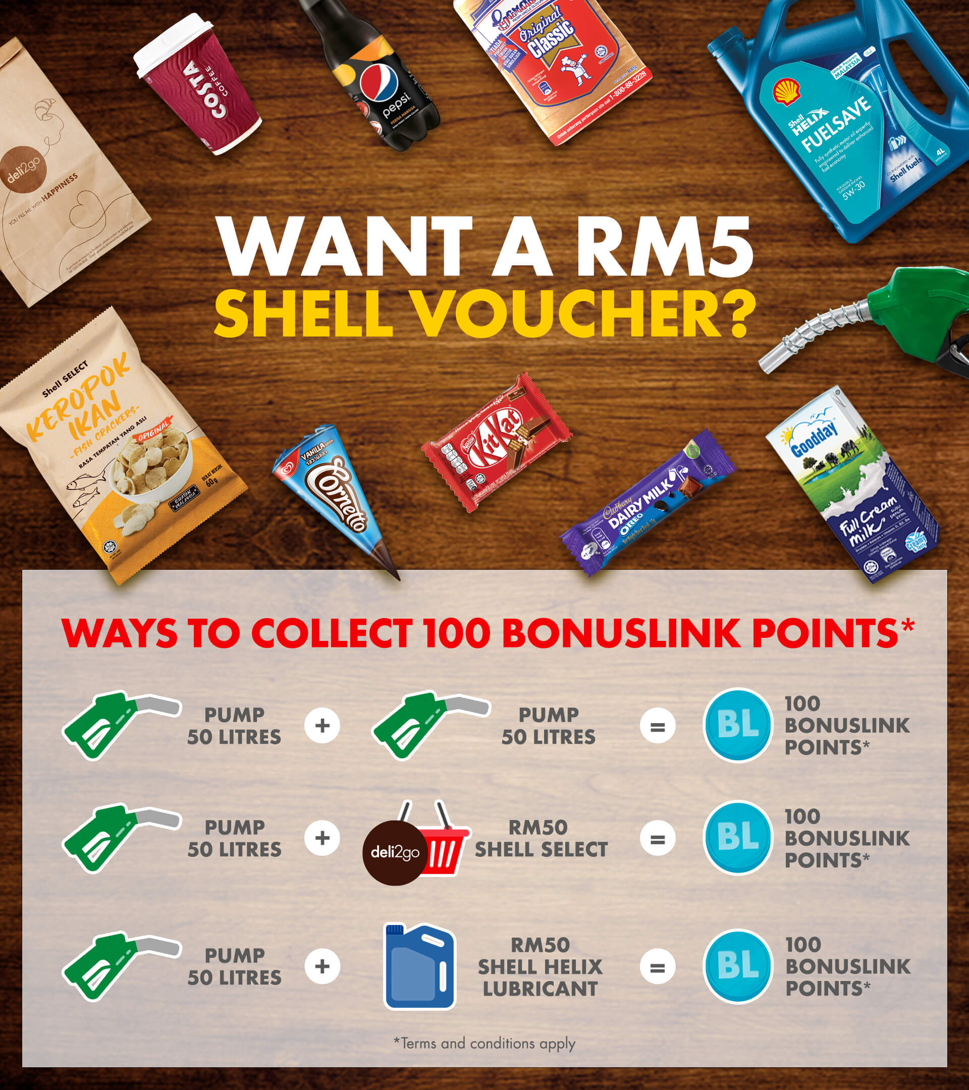 Para pelanggan hanya perlu mengisi minyak atau diesel, membeli snek di Shell Select atau pastri di Deli2Go bersama minuman di Costa Coffee. Mereka bakal menerima e-baucar menerusi aplikasi BLINK apabila mengumpulkan 100 mata standard BonusLink pada bulan tersebut (Mac dan April).